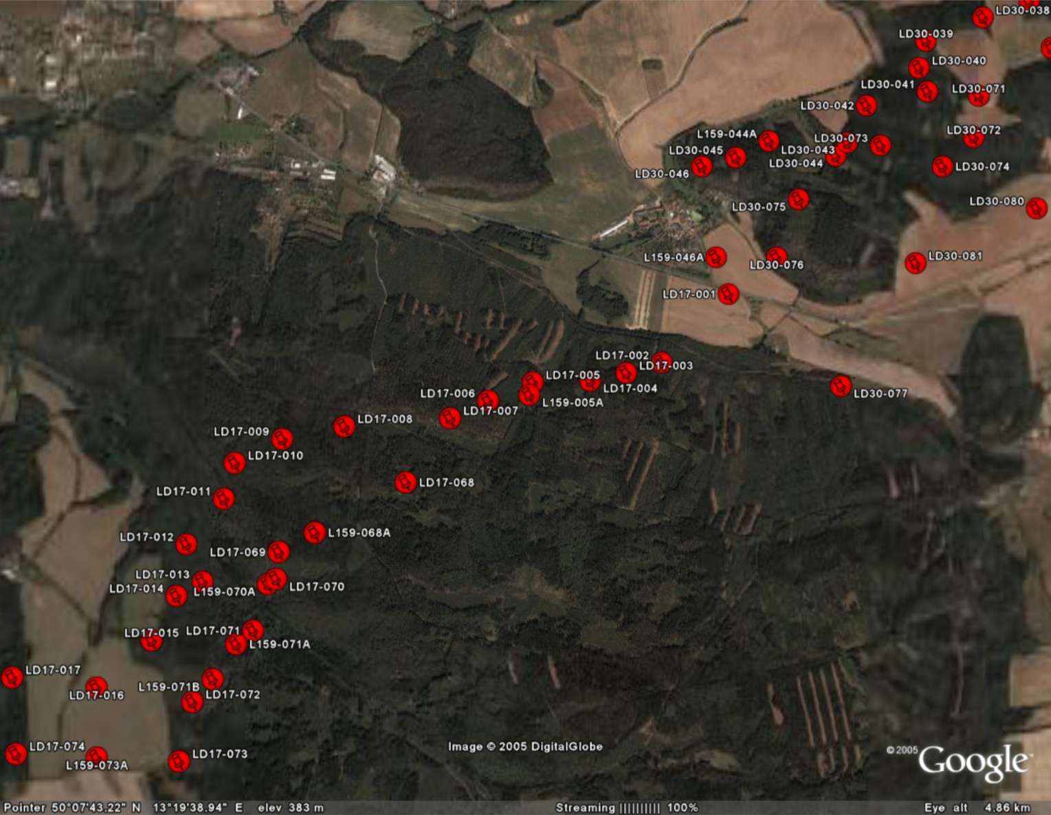 Zdá se, že nový Touratech si dobře rozumí s Google Earth. Na obrázku je linie LO přes silnici na Karlovy Vary. Vpravo nahoře vrch Kapucín, vlevo dole Malměřický les.