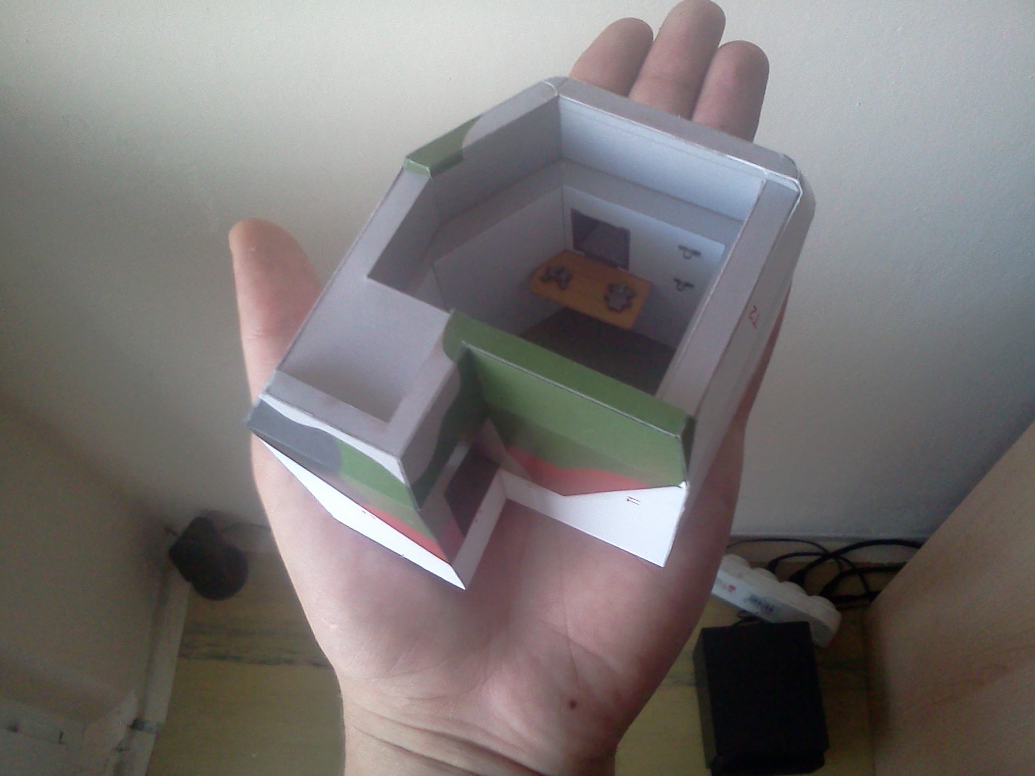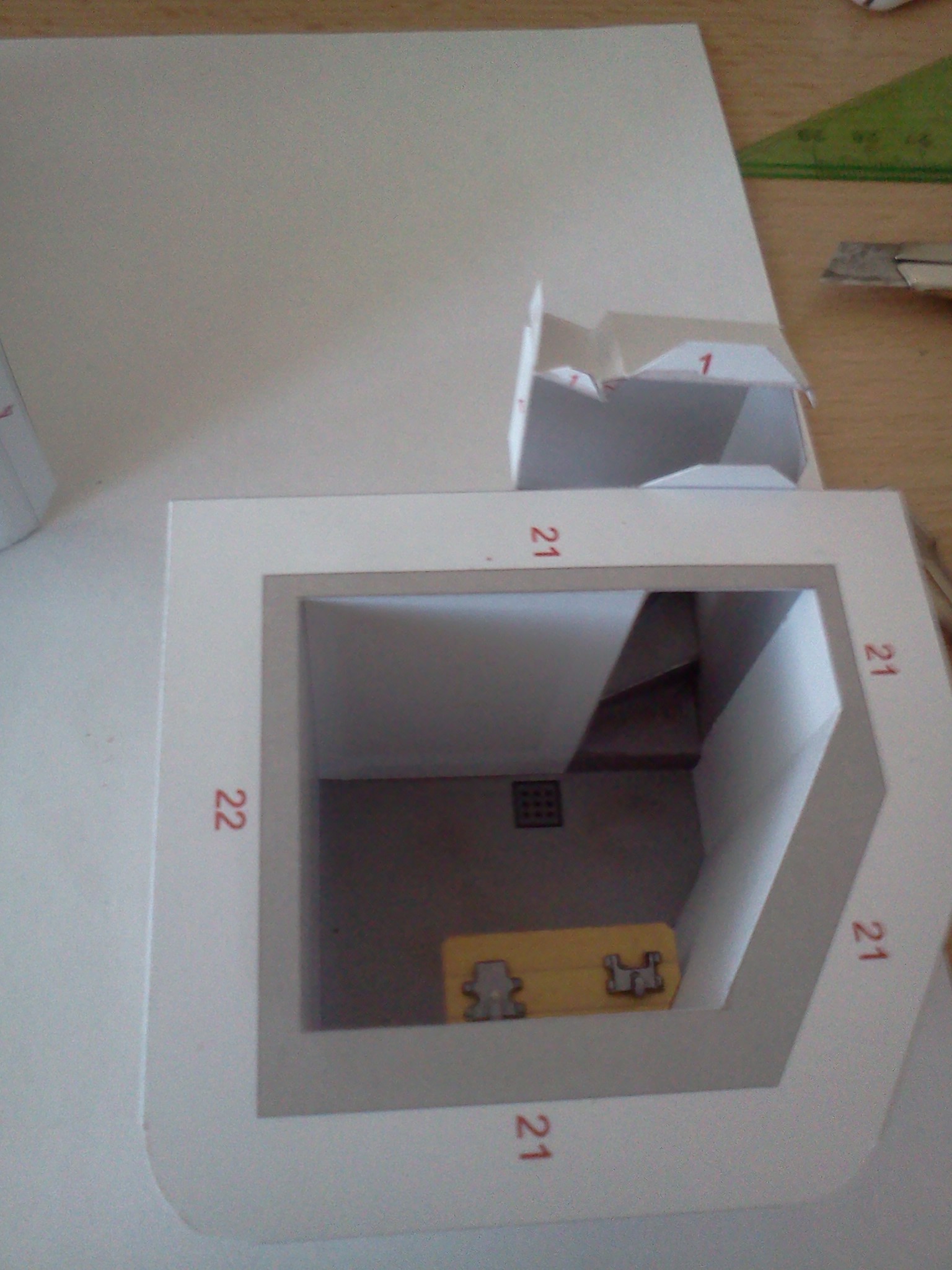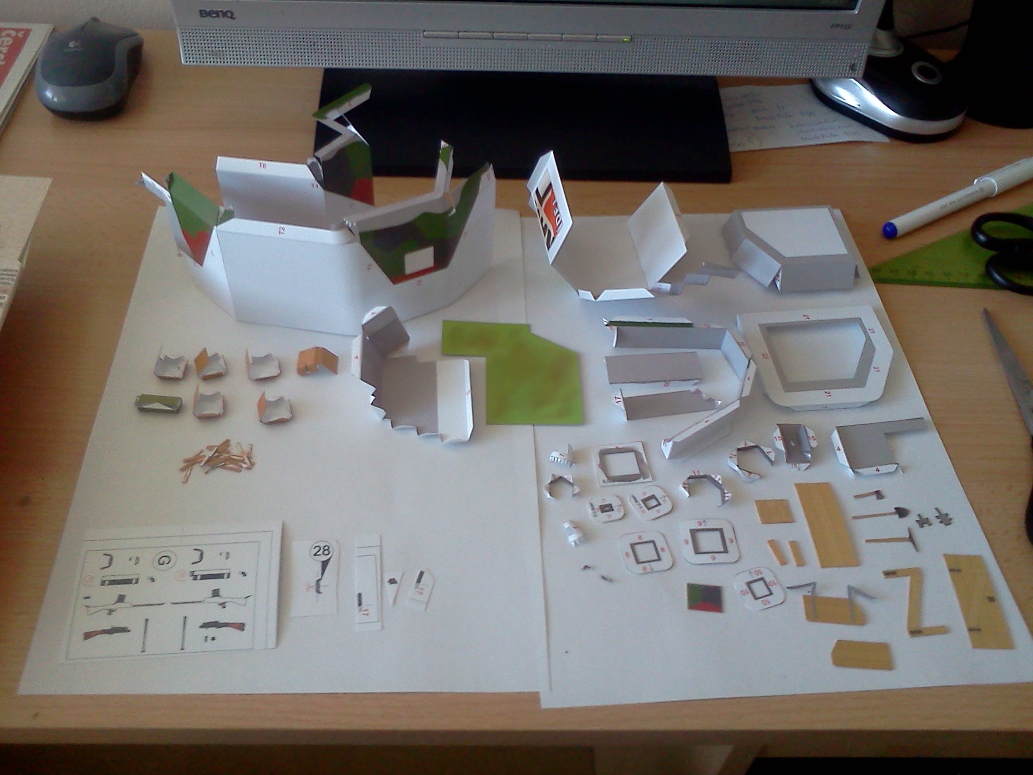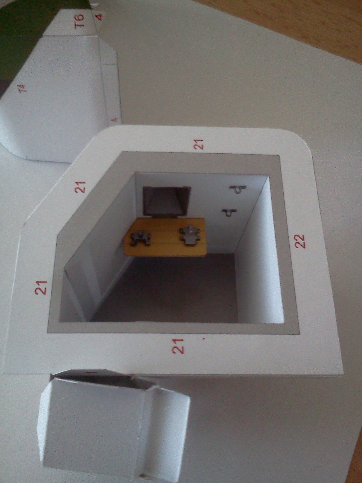 Výsledek začátku kompletace dílů za jedno večerní sezení. Základ interiéru se stolkem, uzávěry střílen a úchyty pro náhradní hlaveň lehkého kulometu, připravený k dovybavení detaily, zkompletovaná střílna v čelní stěně, ženijní nářadí, dřevěné dveře a krycí okenice střílny. K lepení chlopní dílů je nutné používat plochou pinzetu, obzvláště u schodiště a všude tam, kam se nedostaneme prsty. Pro člověka který má prsty jak "banány", tak jako já, je pinzeta naprostá nezbytnost.