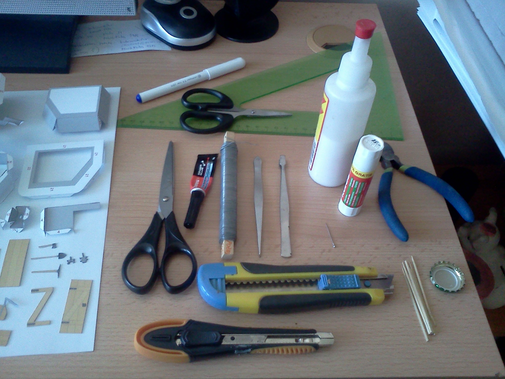 Po delší době mám připravené skoro všechny díly a teď bude následovat jejich kompletace. Přikládám i foto používaného náčiní. Nic speciálního není třeba a vše se dá najít doma nebo bez problémů běžně zakoupit.