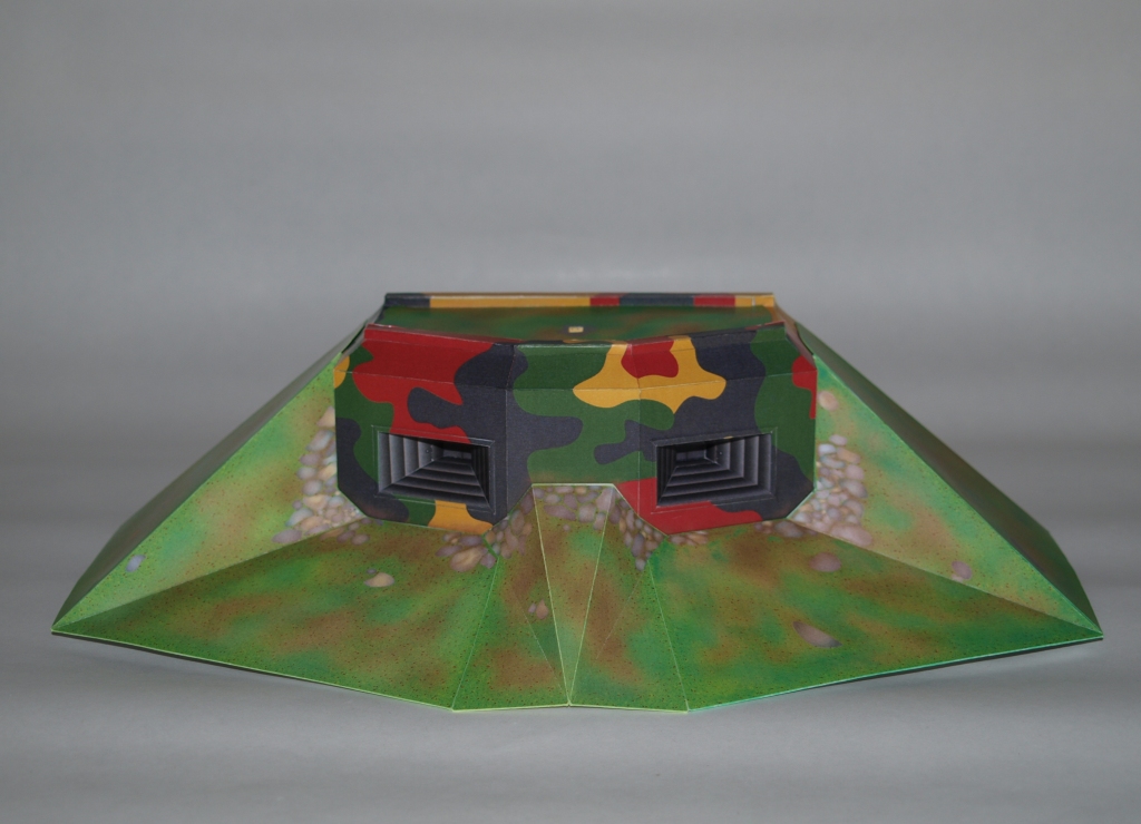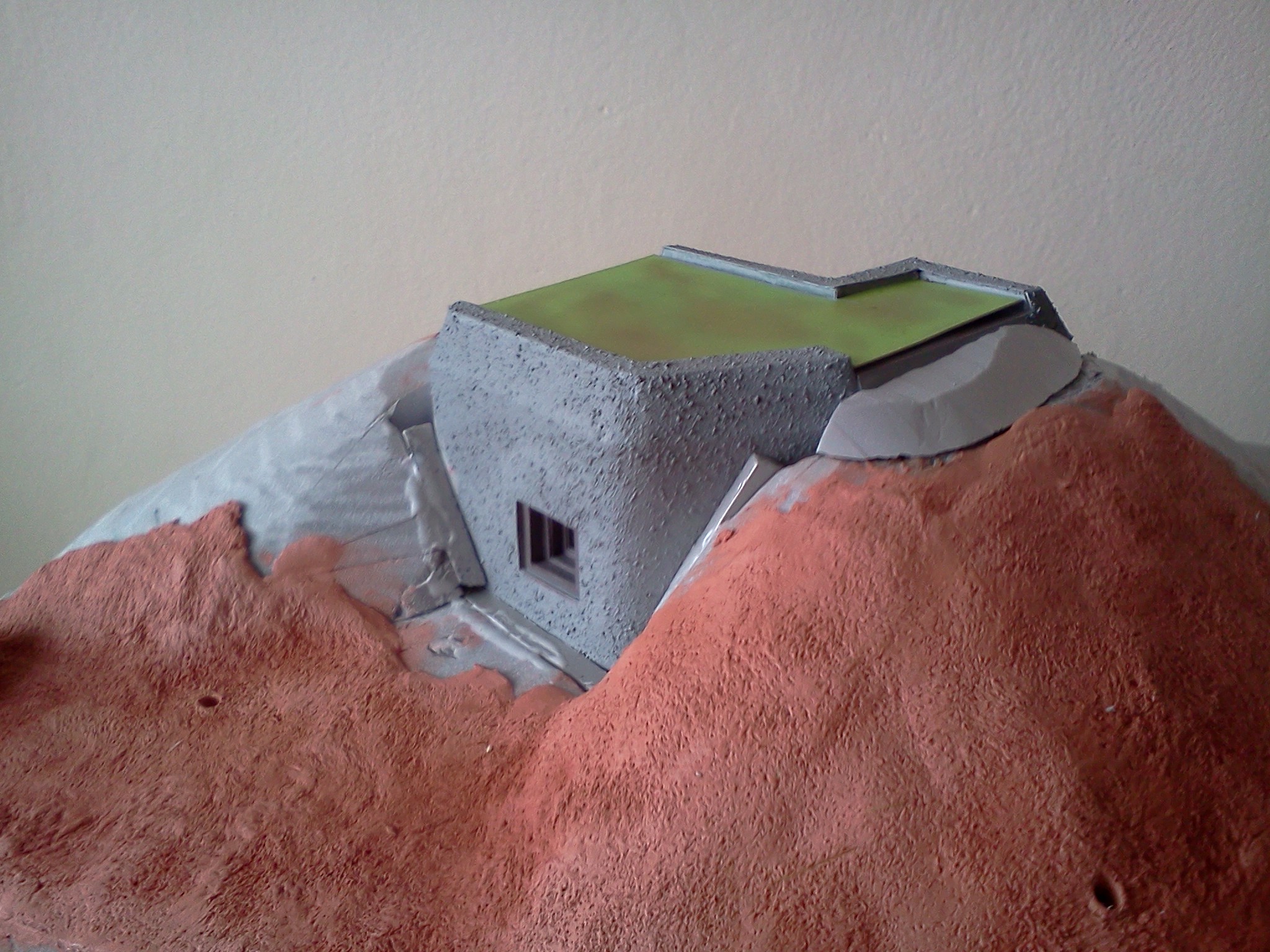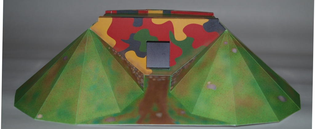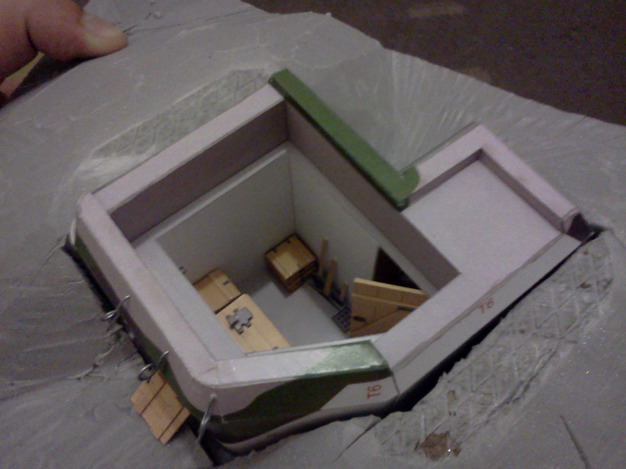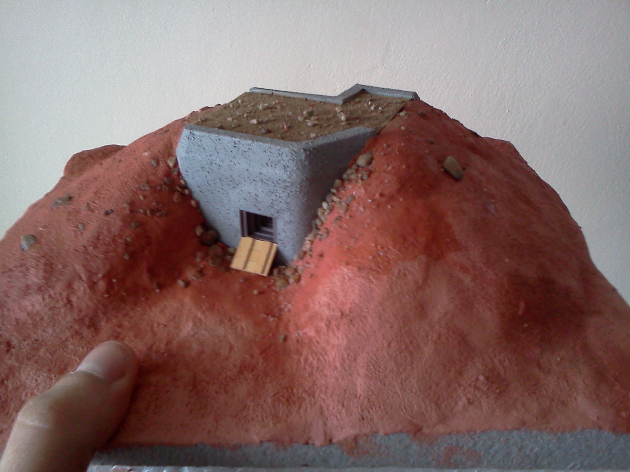 Zkompletovaná pevnůstka s odnímatelným stropem a základ terénu diorámy vyřezaný z extrudovaného polystyrenu. Následovat bude doplnění detailů vystřihovánky v interiéru.