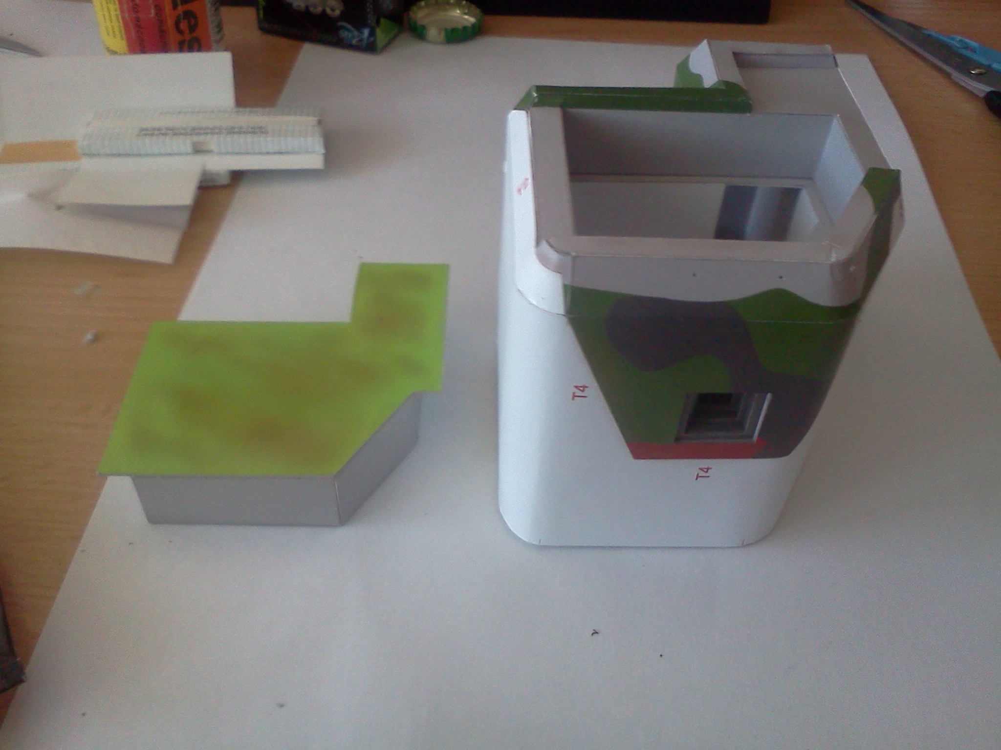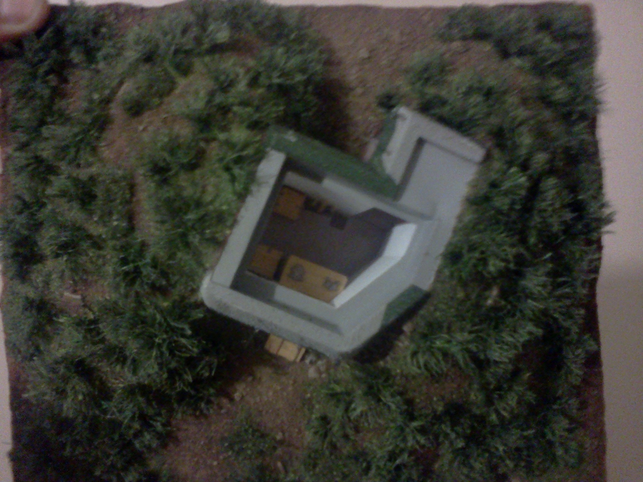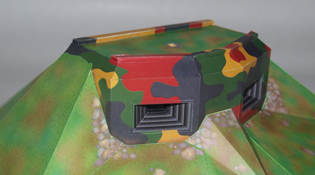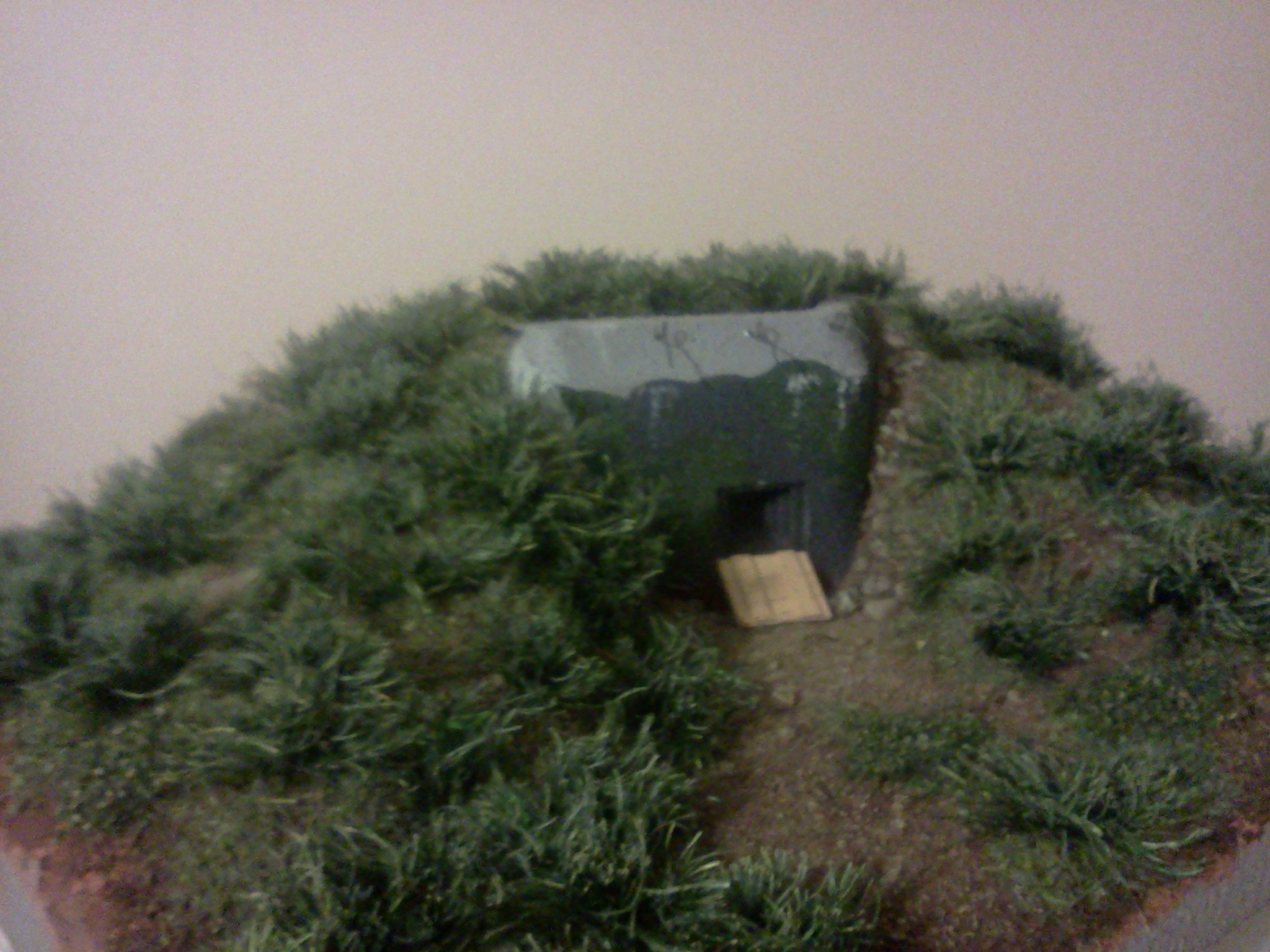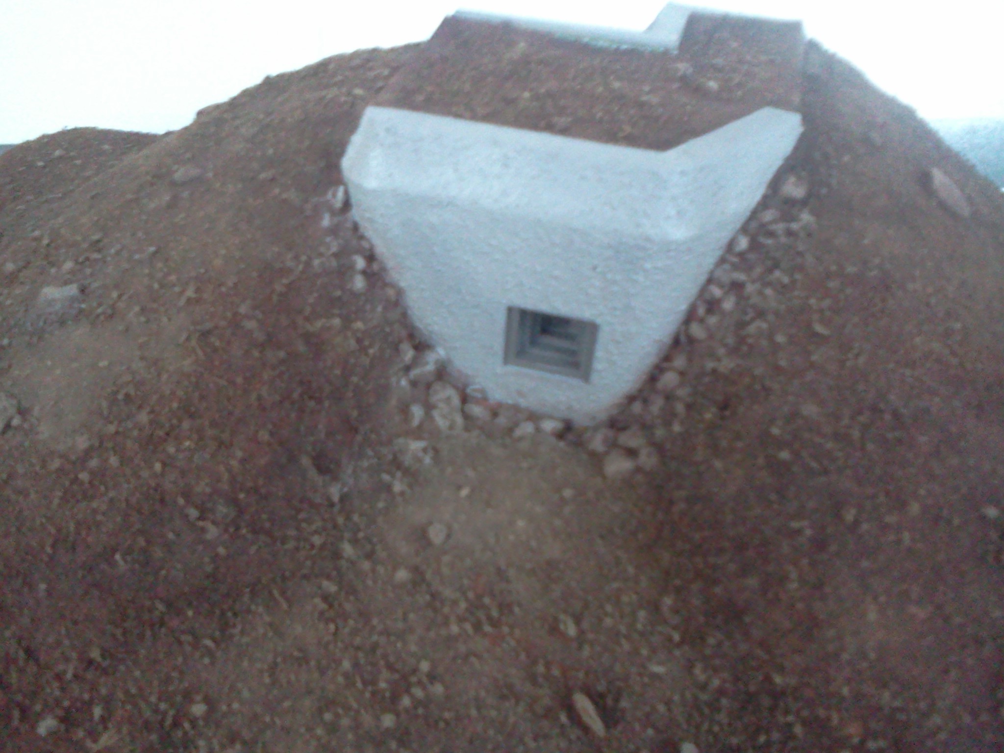 Zkompletovaná pevnůstka s odnímatelným stropem a základ terénu diorámy vyřezaný z extrudovaného polystyrenu. Následovat bude doplnění detailů vystřihovánky v interiéru.
