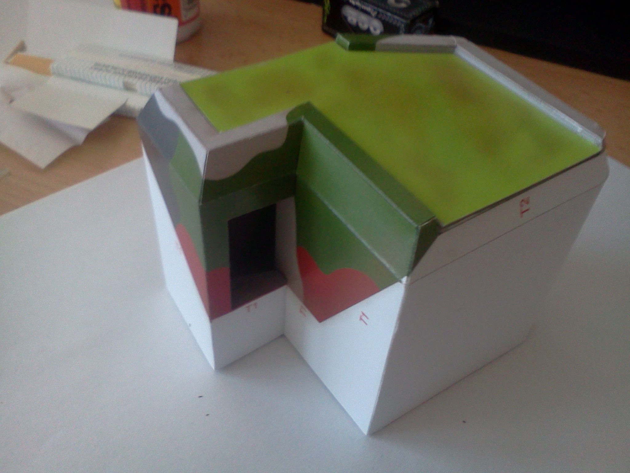 Následuje naohýbání dílů a retuš bílých hran. Díly retušuji zásadně před lepením. Při retuši po lepení hrozí, že na místech kde nám hranu potřísnilo lepidlo se bude barva špatně chytat a nevsákne se do papíru. Na retuš používám tenký kulatý špičatý štětec s vodovými a temperovými barvami.