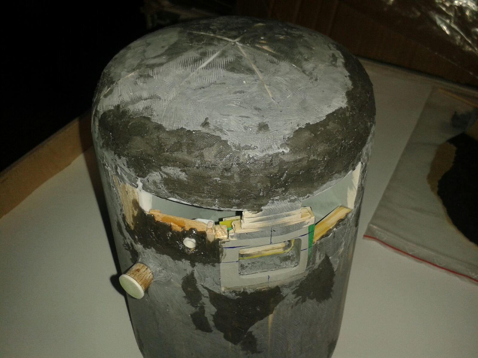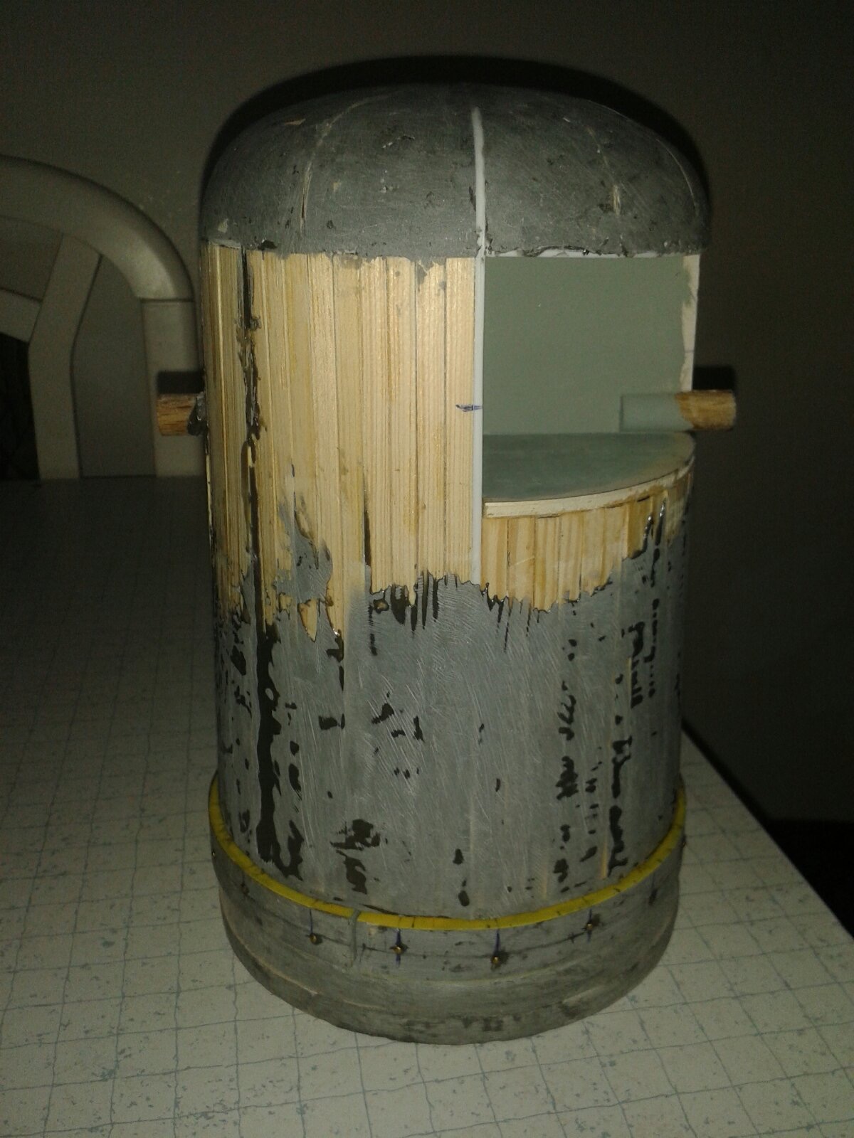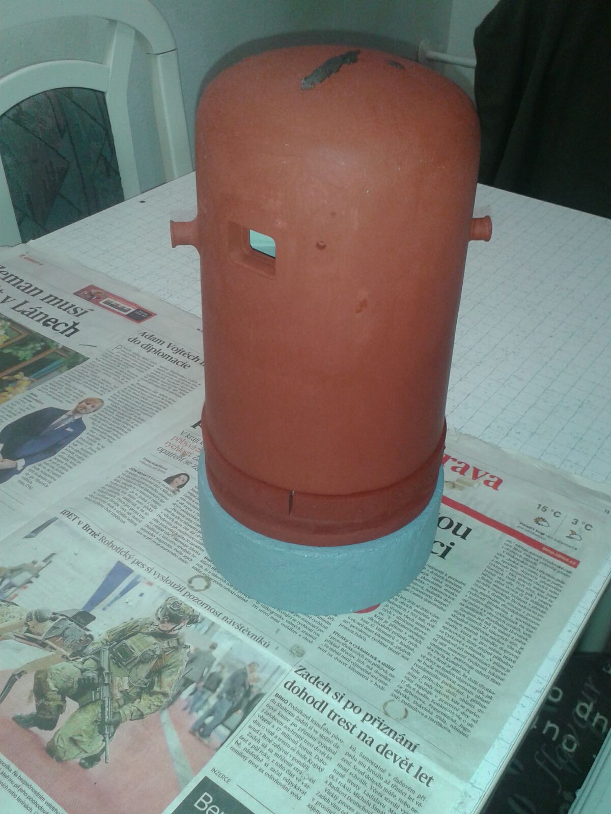 Šedý podstavec na kterém model stojí reprezentuje osazení ve zvonové šachtě resp. jeho zbývající šířku. Tedy šachta opravdu nebyla z nejširších a absence spodních manipulačních čepů je tedy zcela na místě.