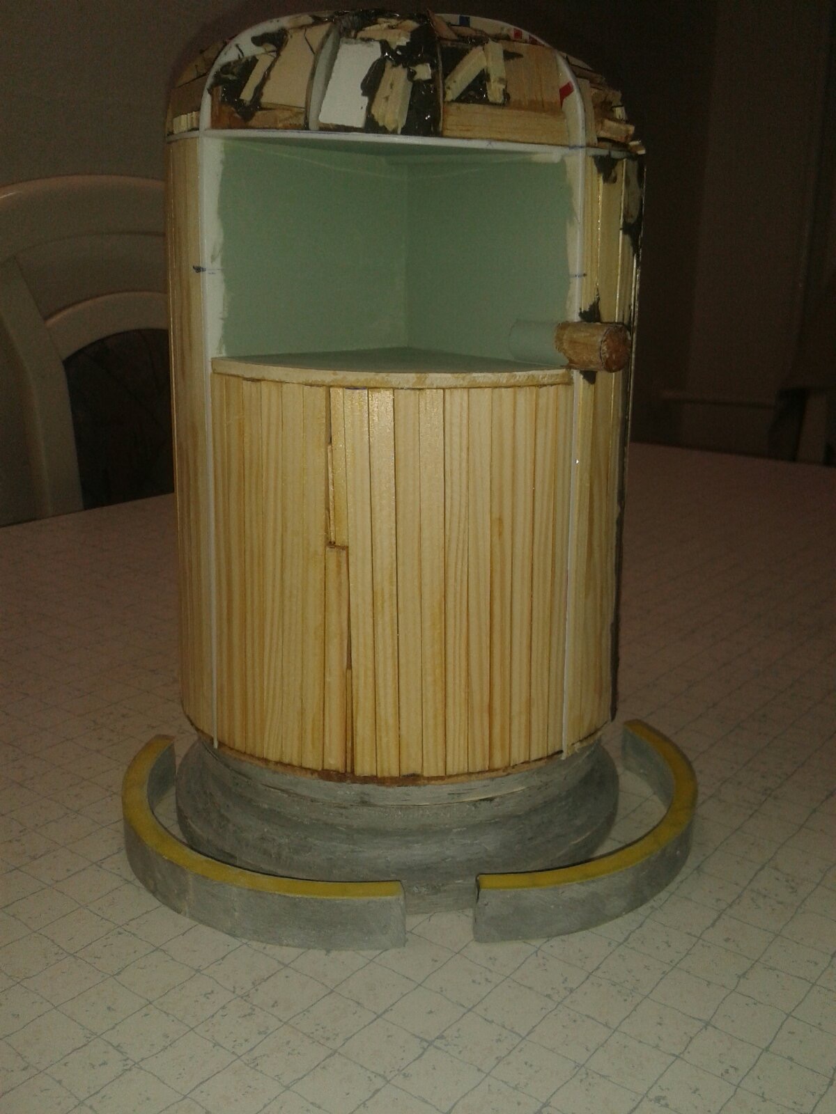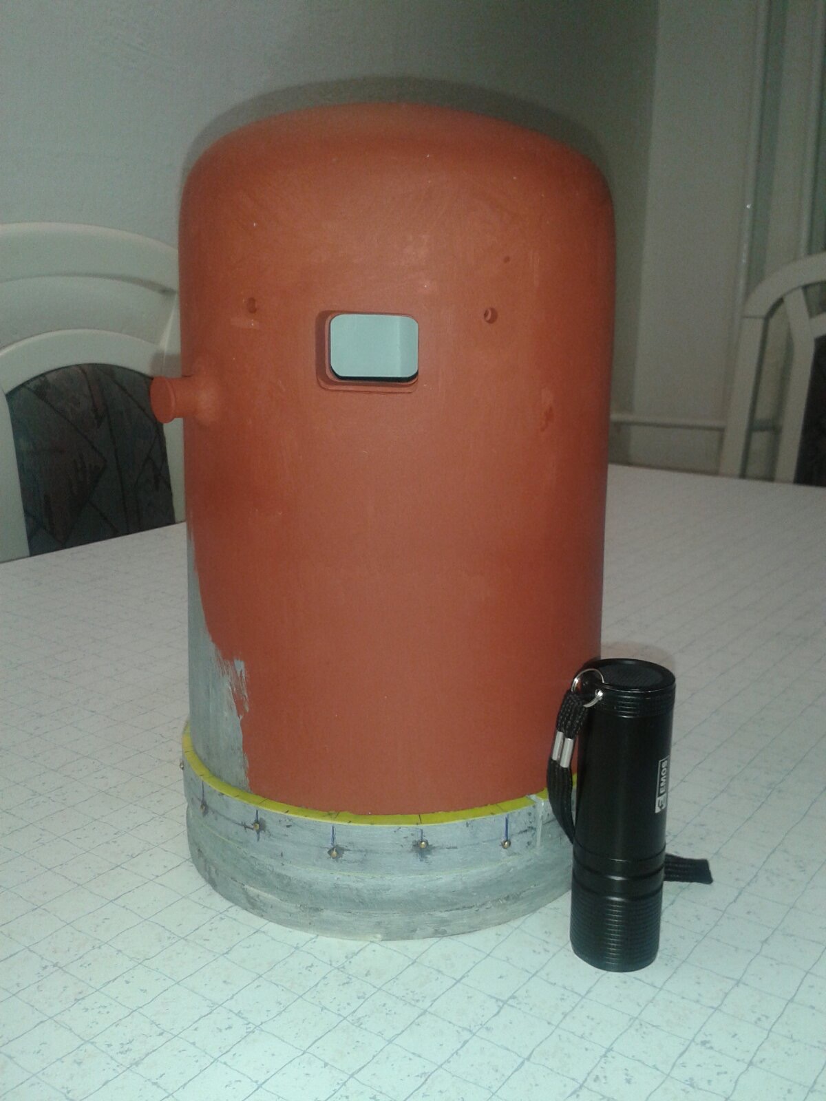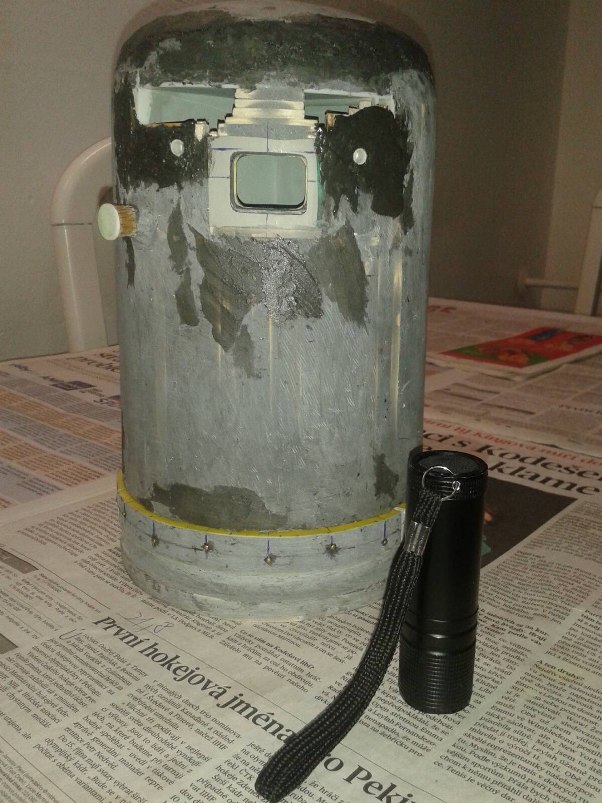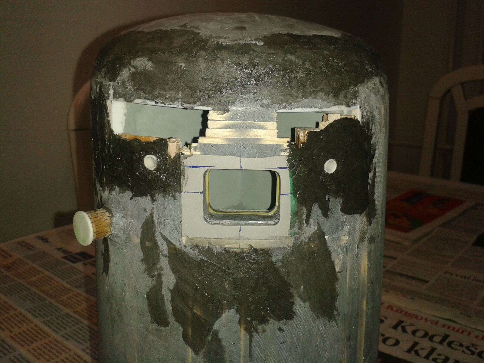 Šedý podstavec na kterém model stojí reprezentuje osazení ve zvonové šachtě resp. jeho zbývající šířku. Tedy šachta opravdu nebyla z nejširších a absence spodních manipulačních čepů je tedy zcela na místě.