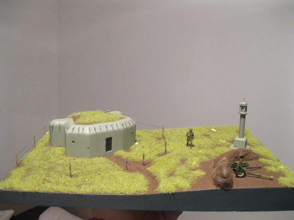 . Kde se vlastně vzalo to kvantum hlíny před dělem? Taky jsme si dávali bokem drny z vrchní vrstvy a pak je umístili na hliněný val ze strany k nepříteli, tak aby nás nebylo hned vidět a trvalo to dýl, než umřem. No a jako modelář bych přidal šutr pod granátový skluz, aby říšská branná moc nepřišla zkrátka, taky bych zahustil (přidal sloupky) překážku okolo řopu, tahle mi to trochu připomíná výběh. Ještě bych tu překážku udělal v klasickém tvaru bez ohledu na tvar podložky i za cenu jejího přerušení.