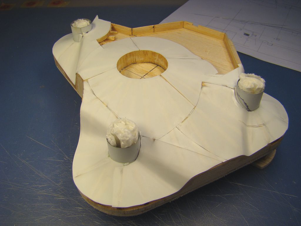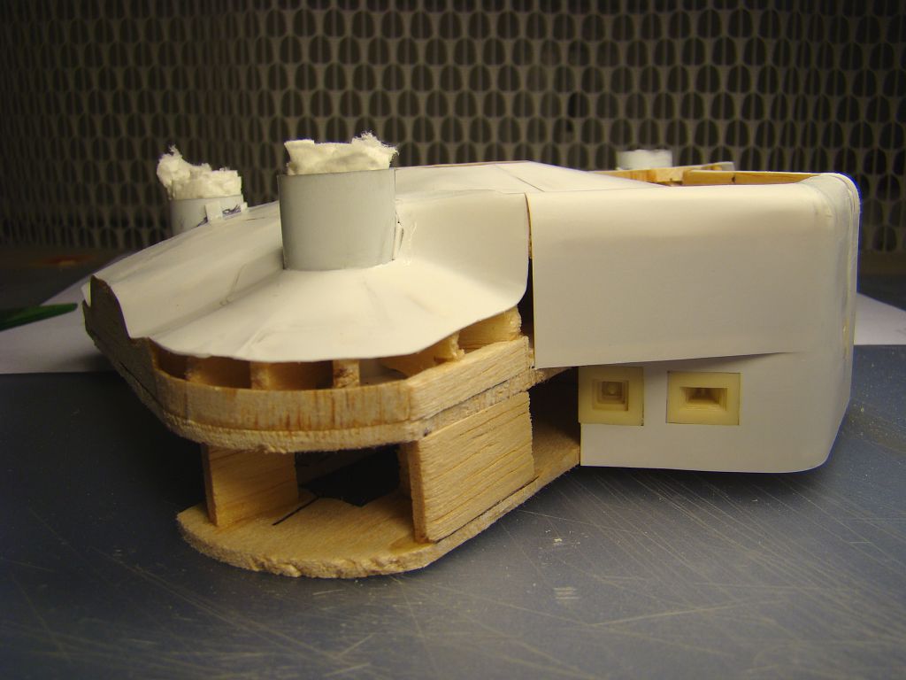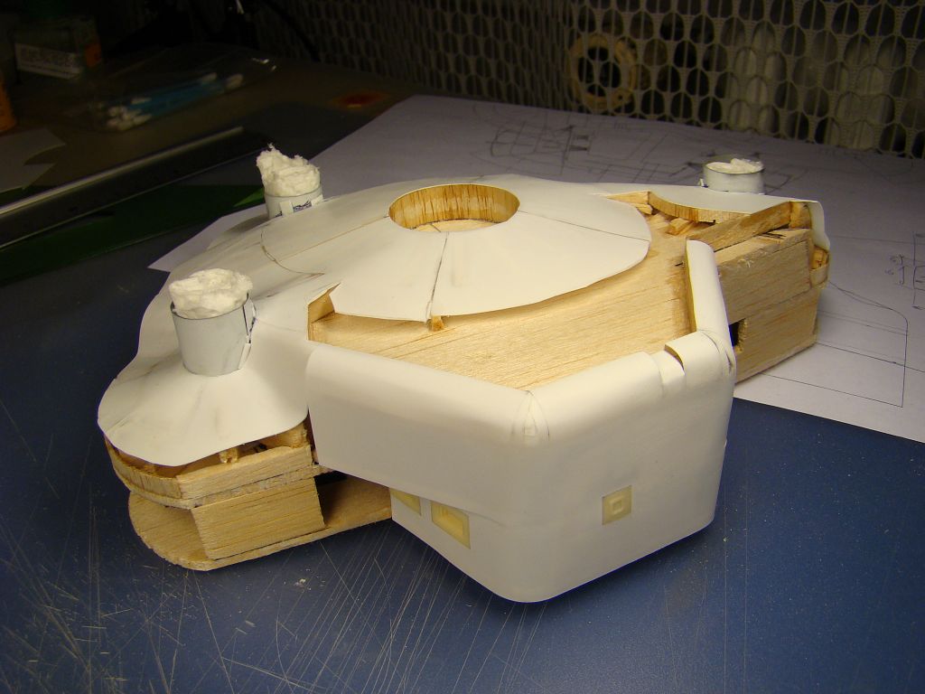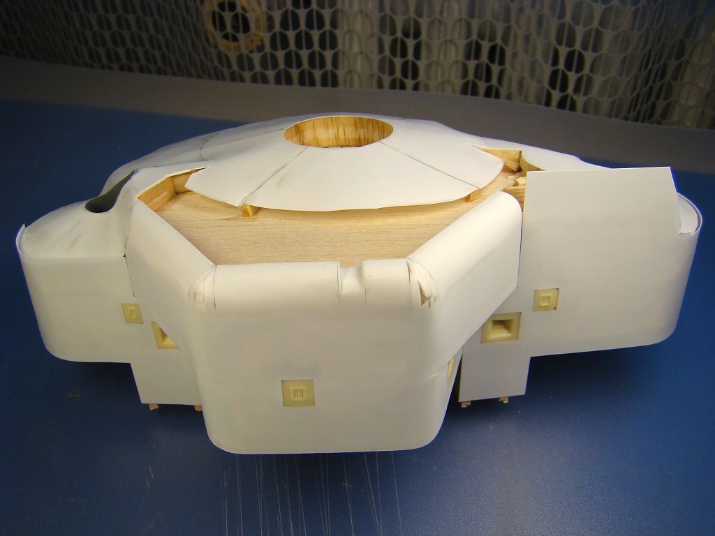 Začínám kompletovat týlovou část, zatím mám hotový jeden díl ze tří, střílny hlavních zbraní a prostřední čtyřvýfuk už jsou na svých místech. Stropní deska je z větší části vytmelená a vybroušená, zbývá dodělat zaoblené přechody