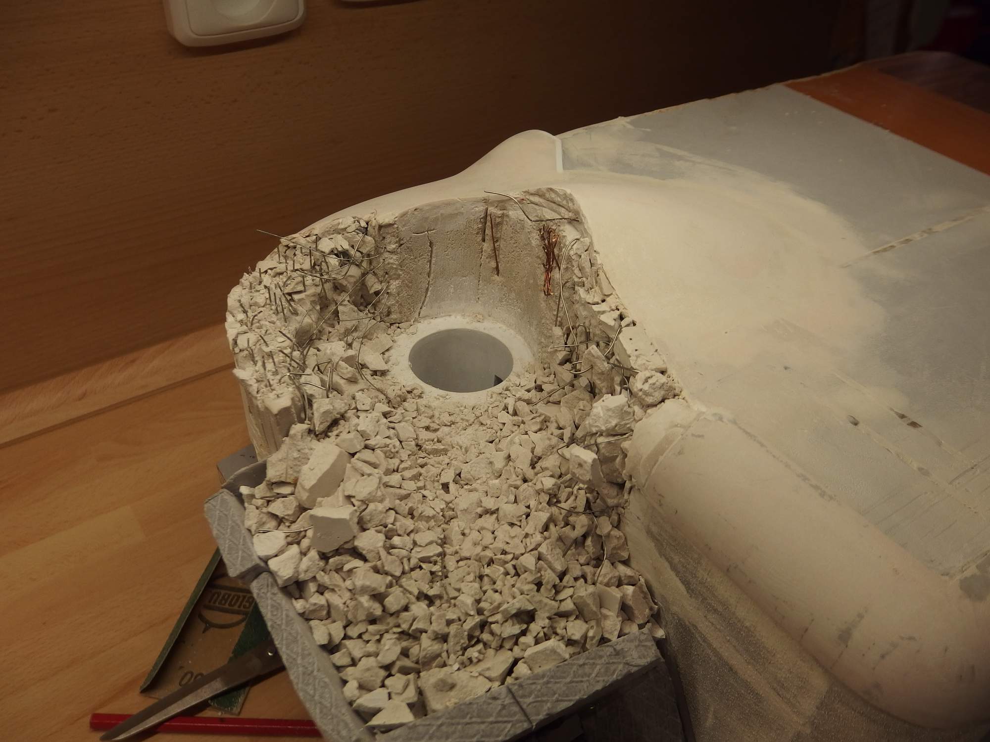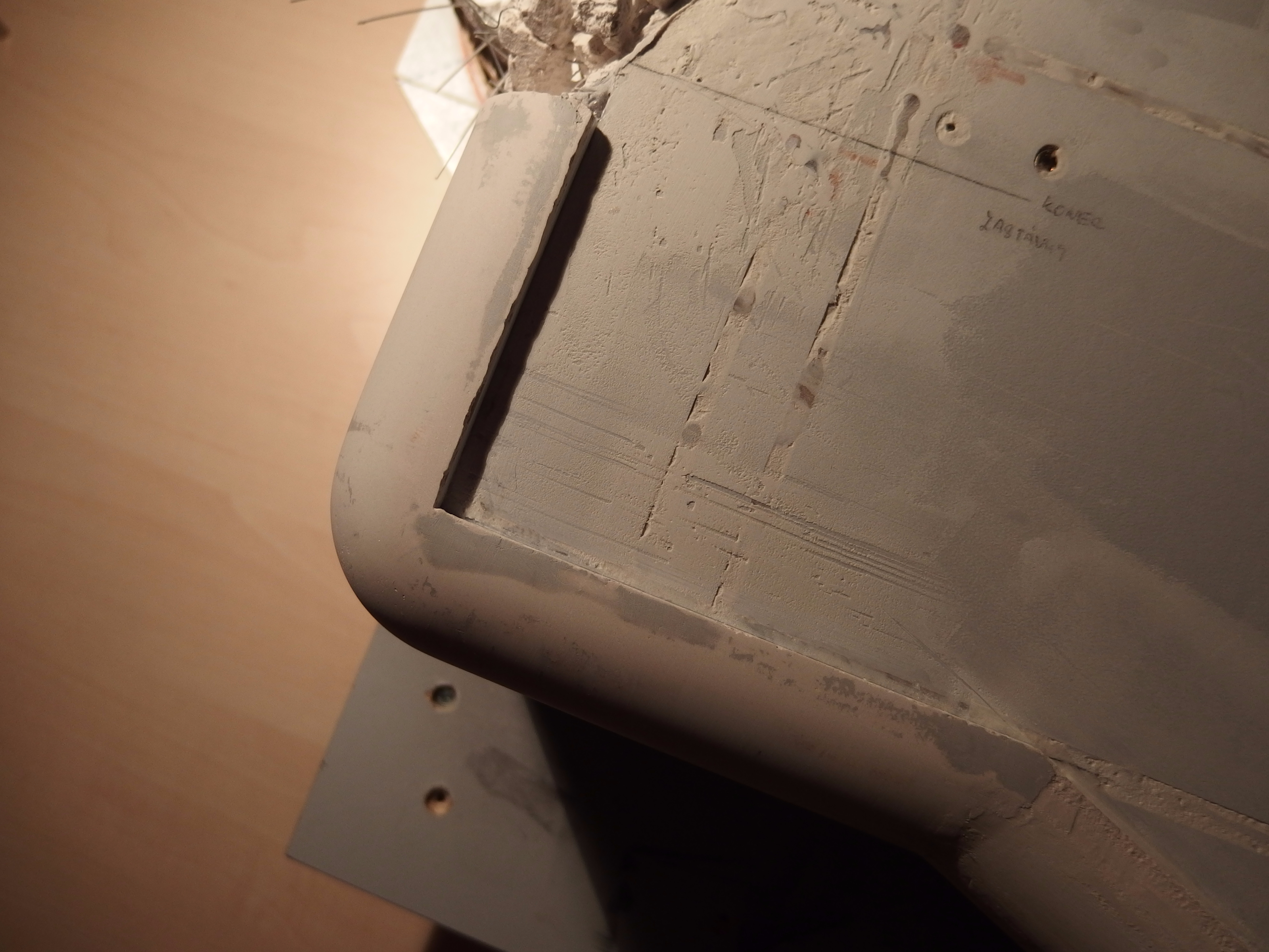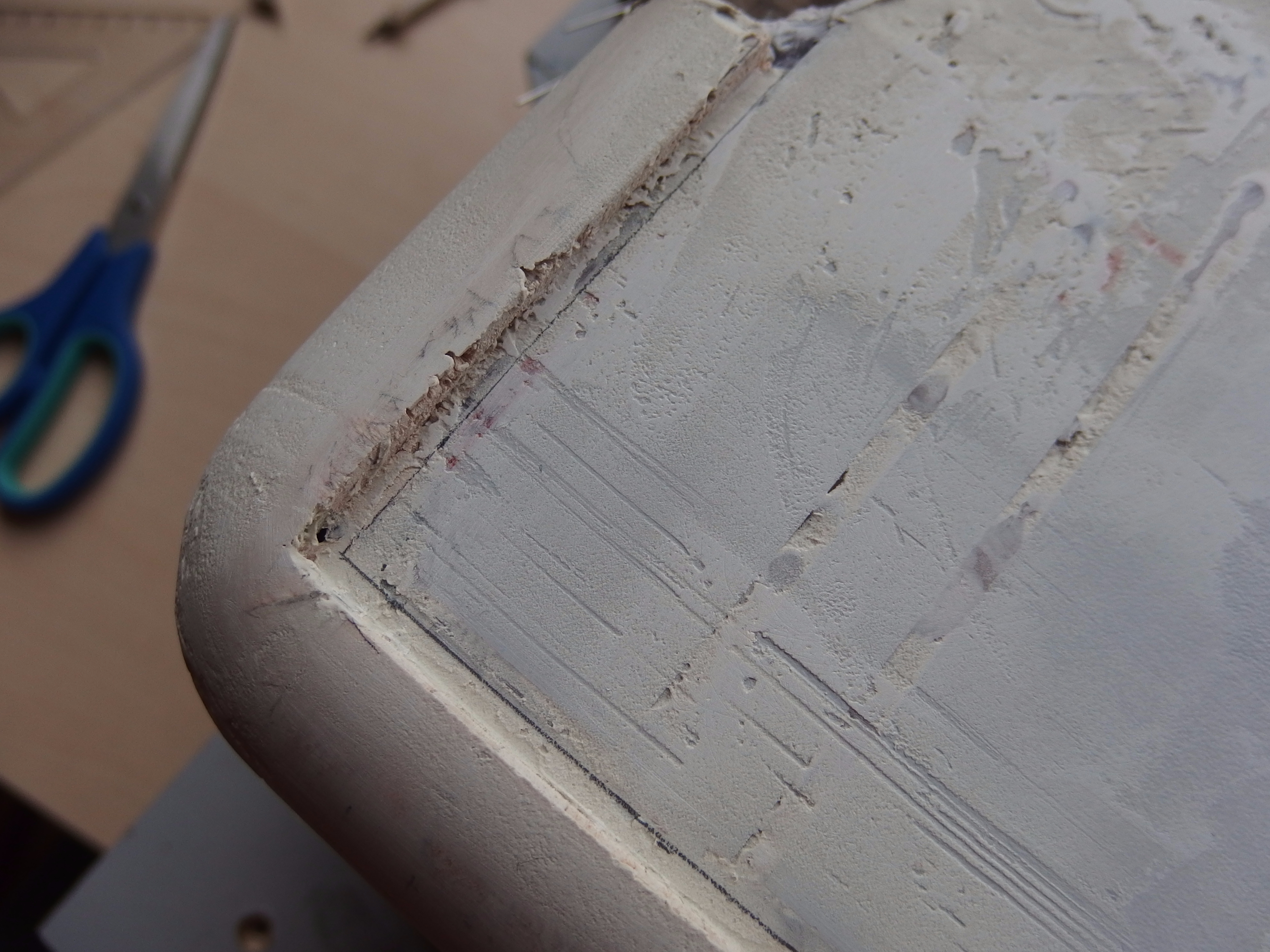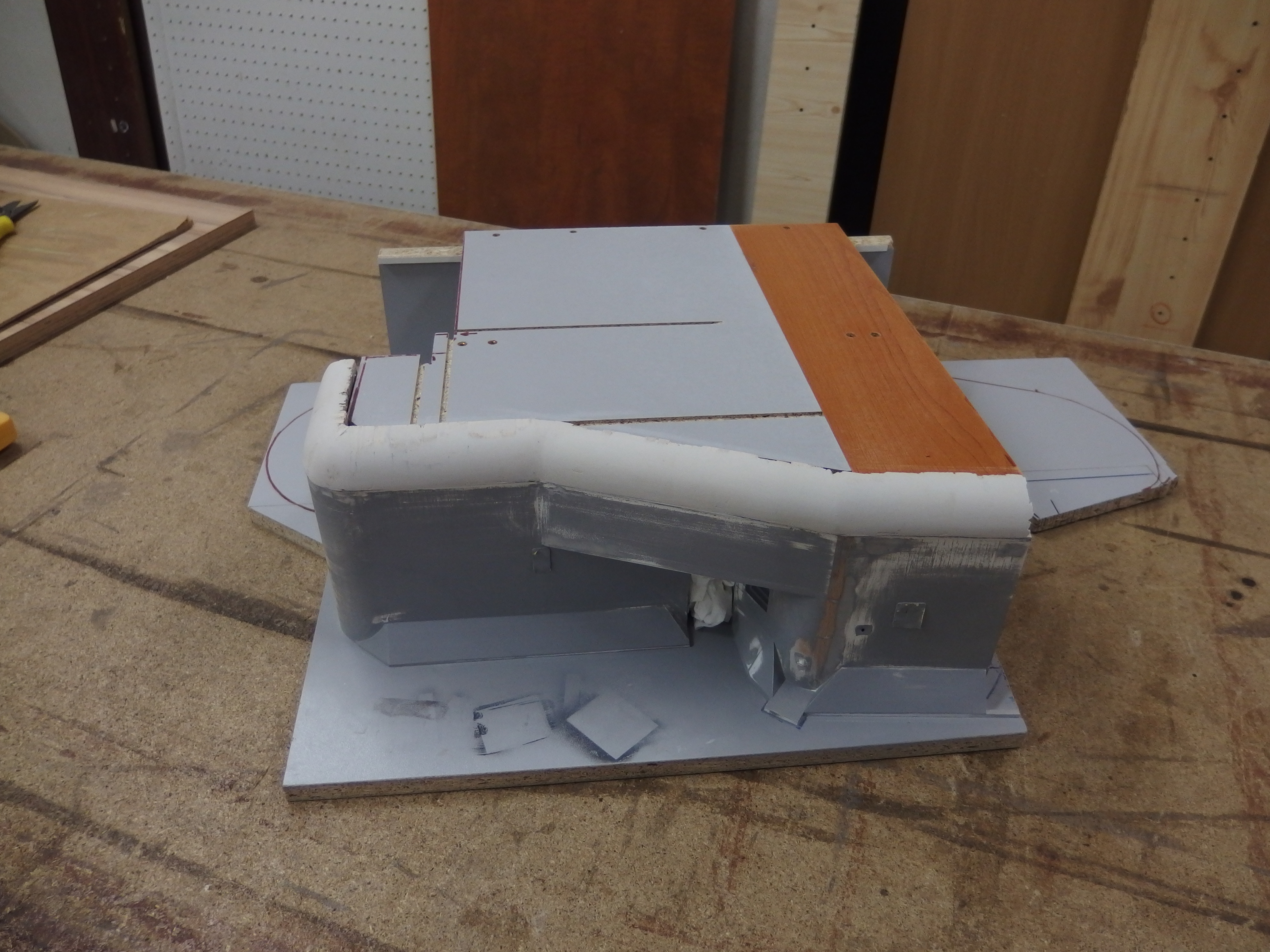 Schod jsem vyřešil nalepením plastové destičky o síle 1,5 mm na hranu týlových stěn a teprve na této destičce jsem vytvořil oblý přechod z balzových 1/4 koleček potažených tmelem. Při tvorbě přechodu je už nutné mít i stop, čímž celý objekt značně nakynul. Do té doby jsem pracoval pouze s týlovou částí a proto jsem musel rozšířit podkladovou desku a vyrobit čelní stěnu.