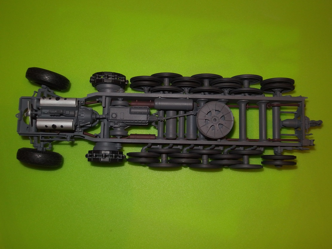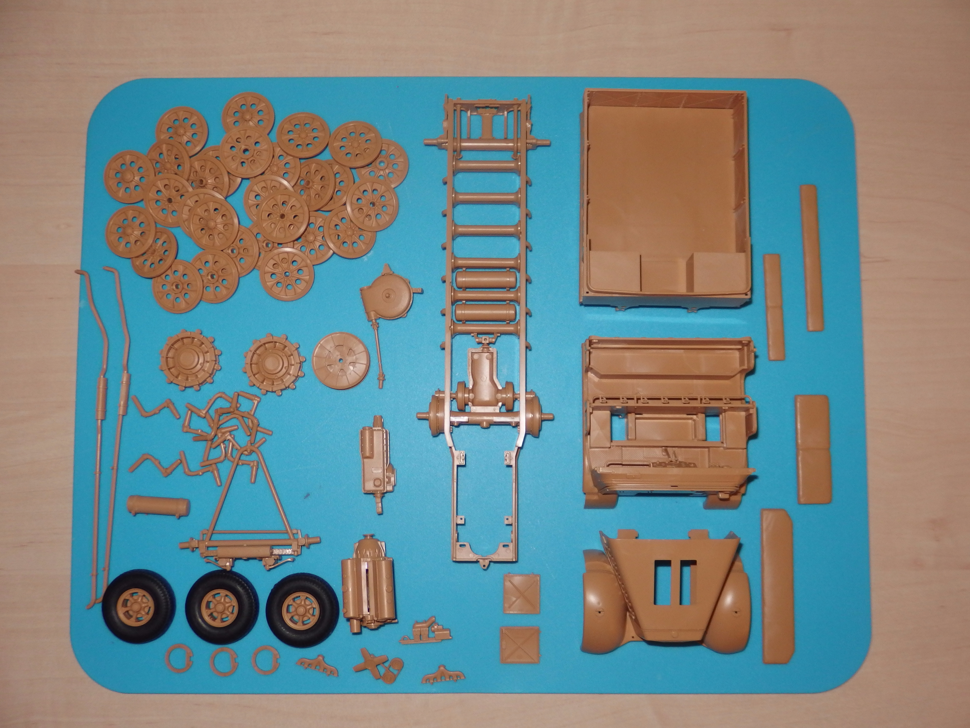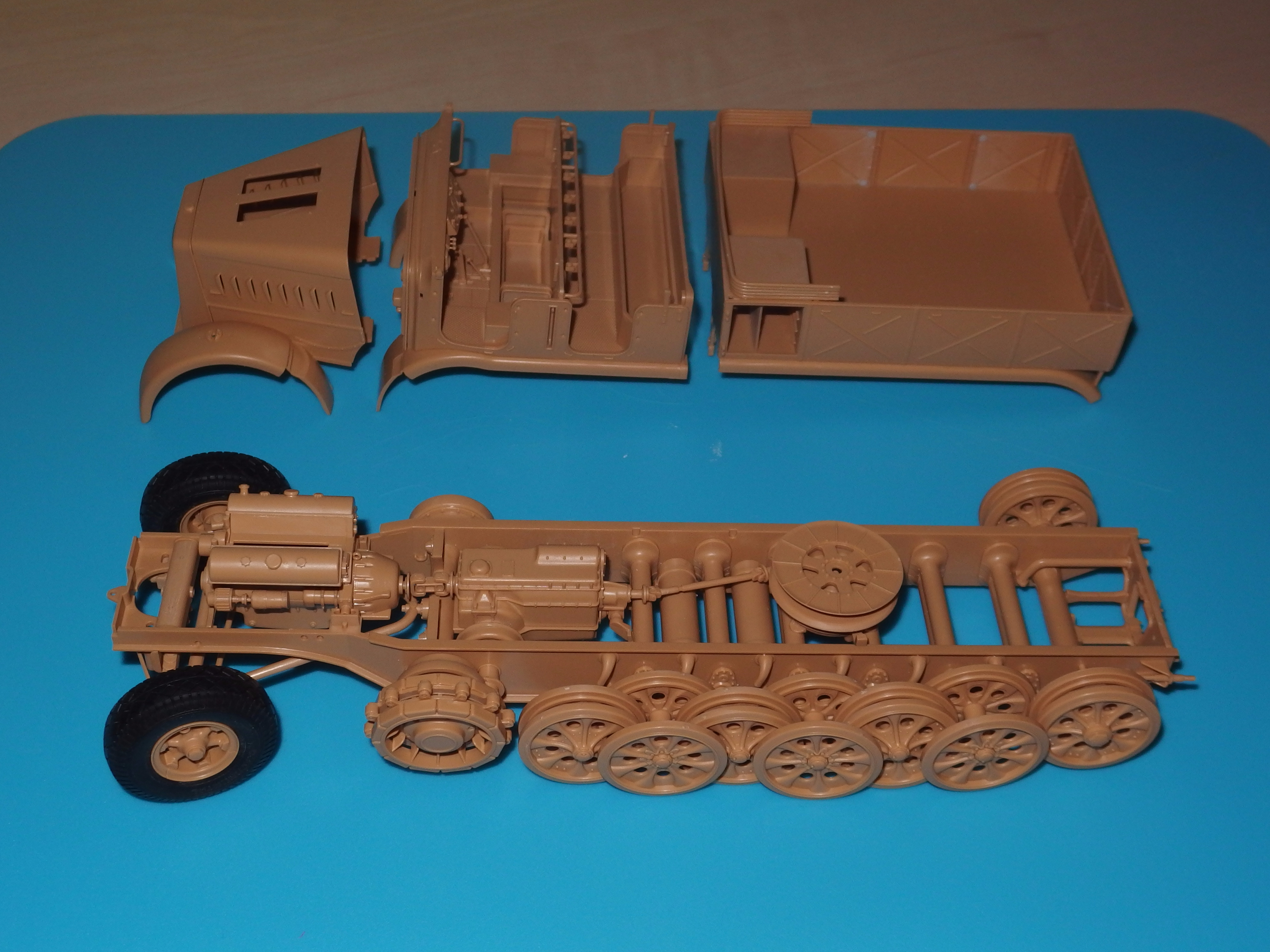 Stavba tahače Sd. Kfz. 9 zdárně postupuje. Dílů je tam jako na orloji, a to ještě zdaleka nejsem u konce. Pomalu budu muset začít barvit, abych to už mohl dát dohromady. Je to ale skvělá stavebnice, protože u většiny dílů stačilo pouze očistit stopu po připevnění rámečku. Na korbě bylo pár stop po vyhazovačích, které jsem dílem zatmelil a dílem vybrousil.