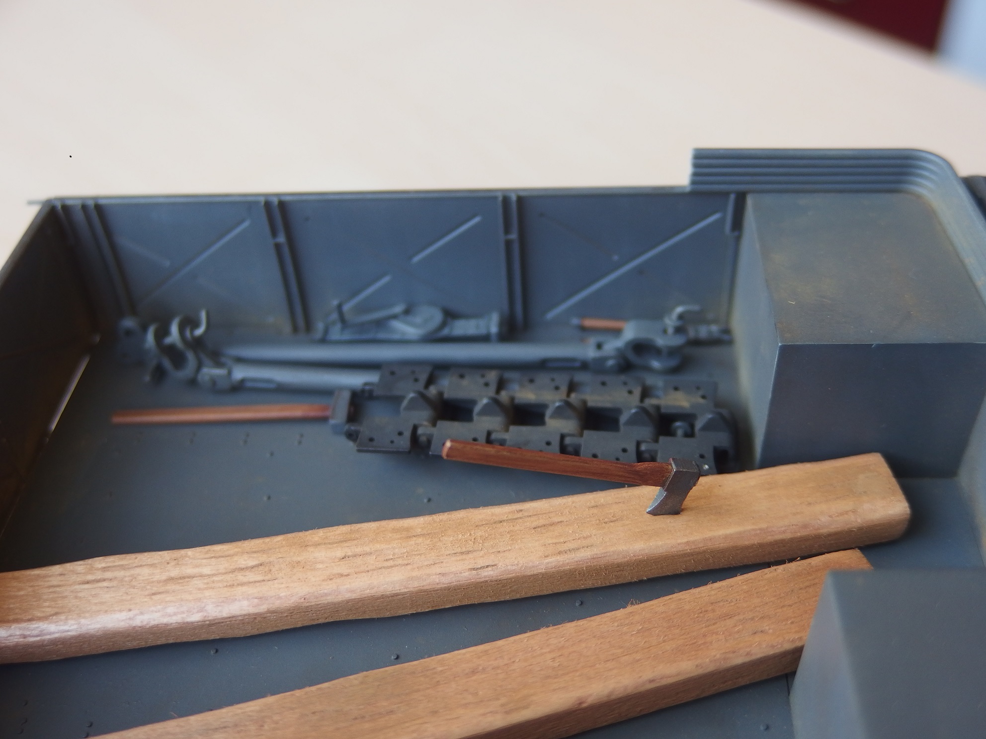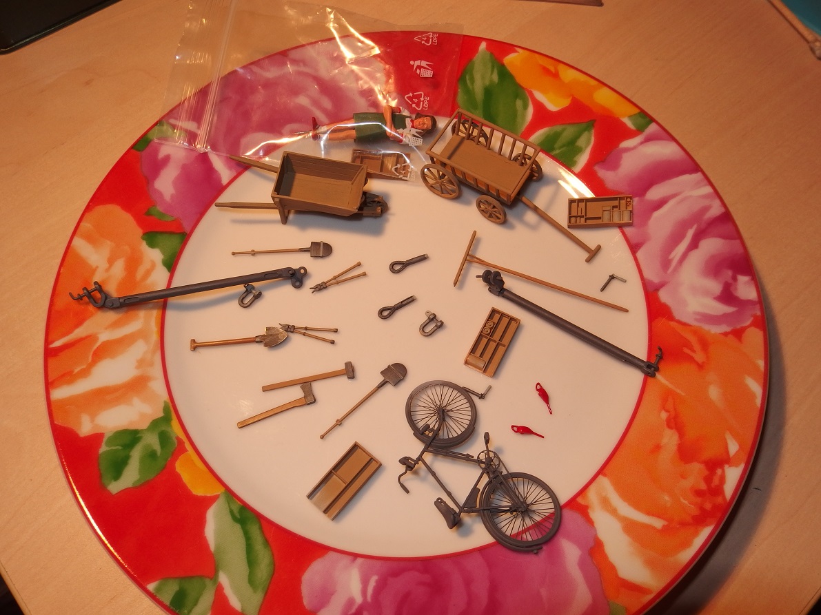 Během týdne přibylo pár figur, nářadí k tahači a doplňky k figurám došly finální úpravy. Podvozek tahače je komplet a brzo dostane karosérii.