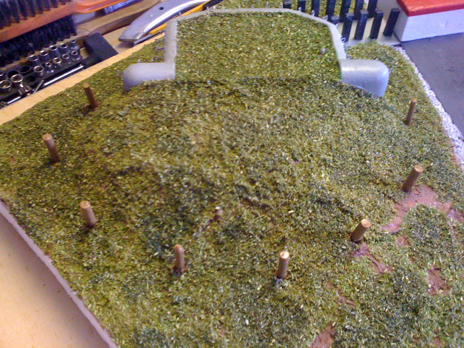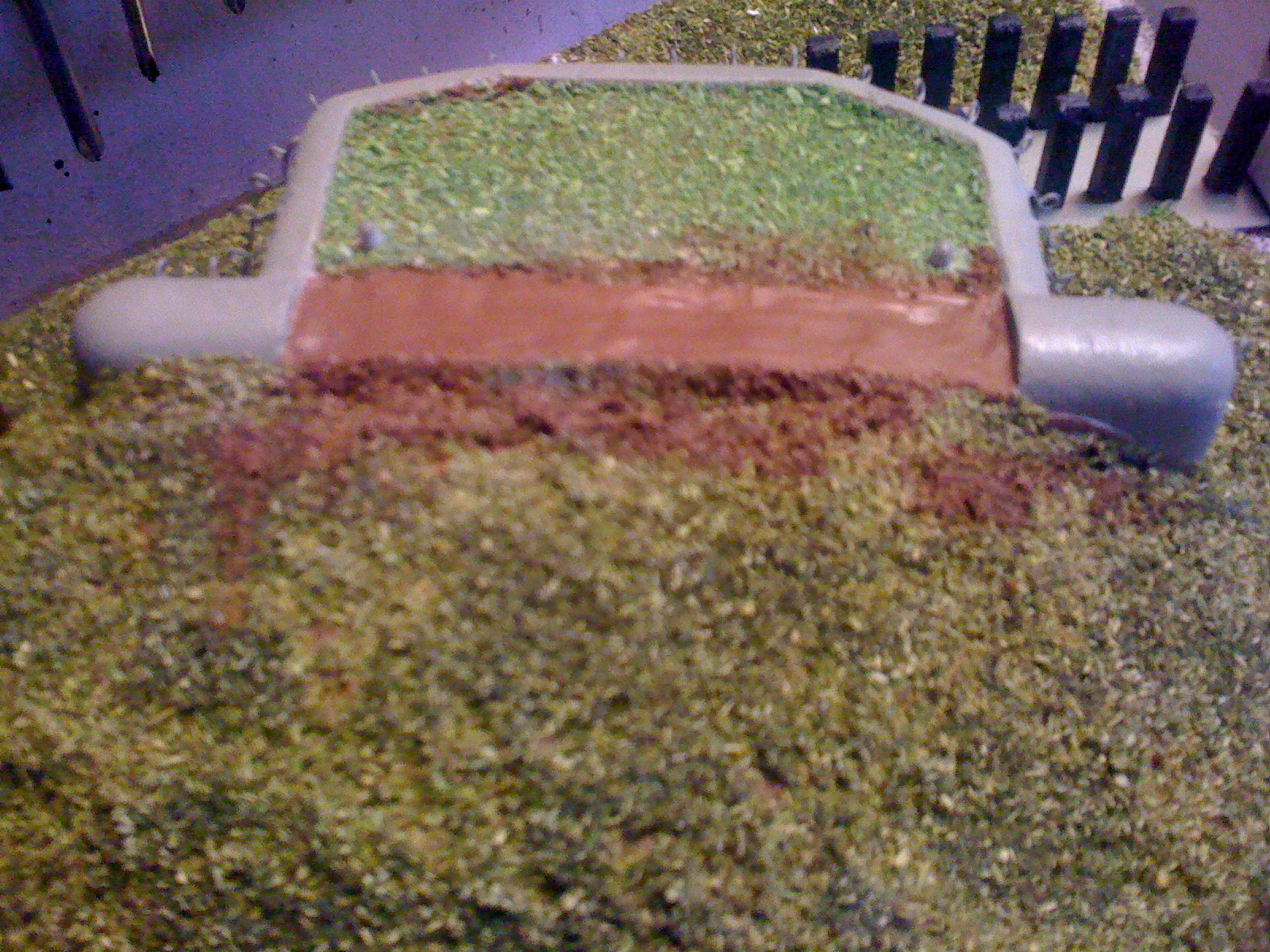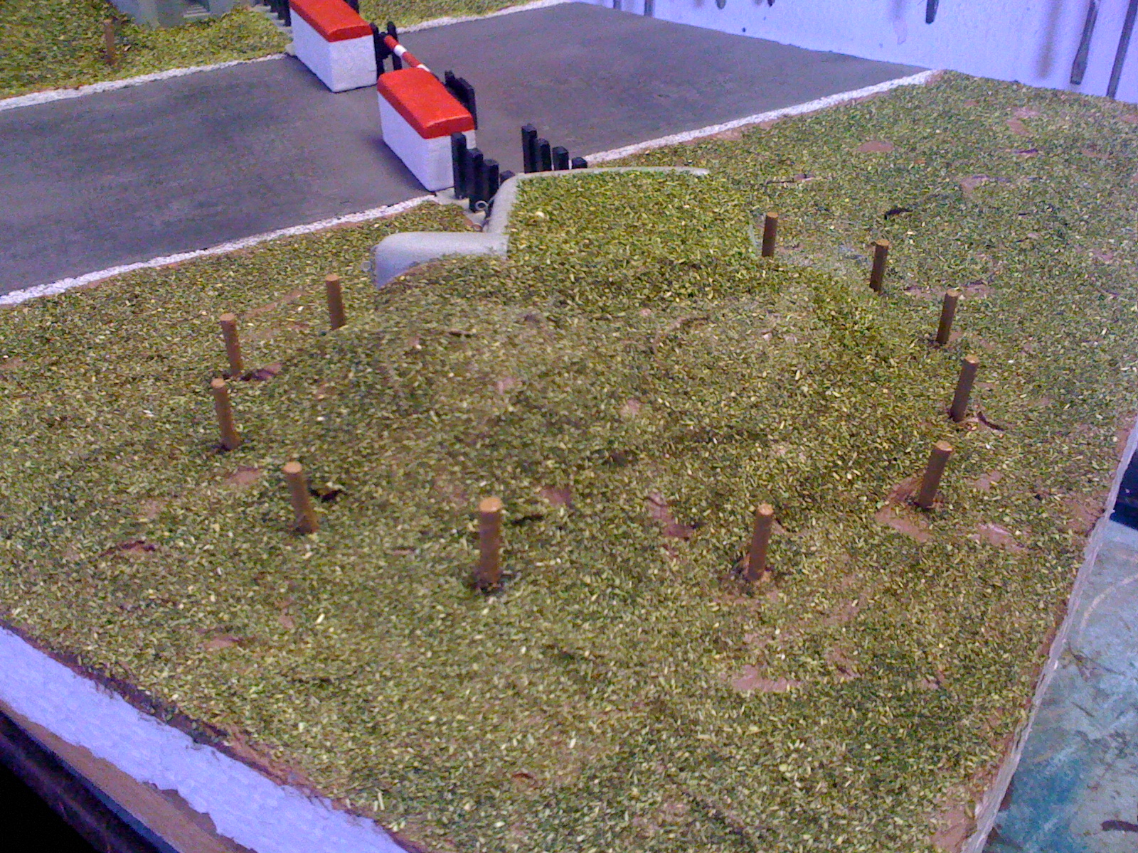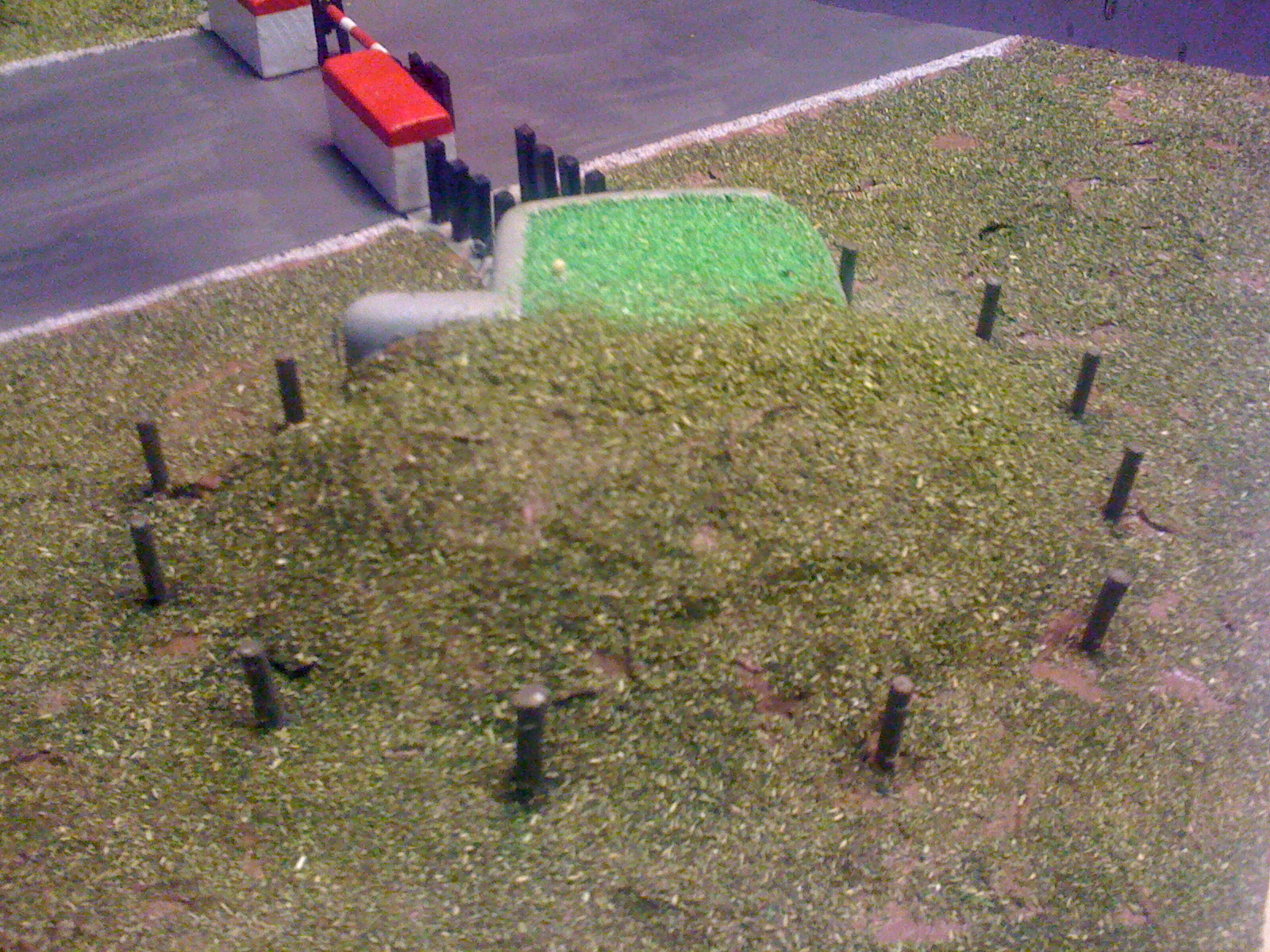 Toho jsme si plně vědom. Původní záměr byl opravdu aby posyp na stropech řopíků byl světlejší. Chtěl jsem to trochu odlišit od okolí a v podstatě to má simulovat čerstvě nasazenou trávu. A pokud jsme neměli na zahradě nějakou opravdu speciální, tak čerstvě nasazená tráva by měla být o něco světlejší. Teď je otázkou, zda to nekazí celkový dojem modelu. Pokud ano, myslím, že nebude problém to přesypat