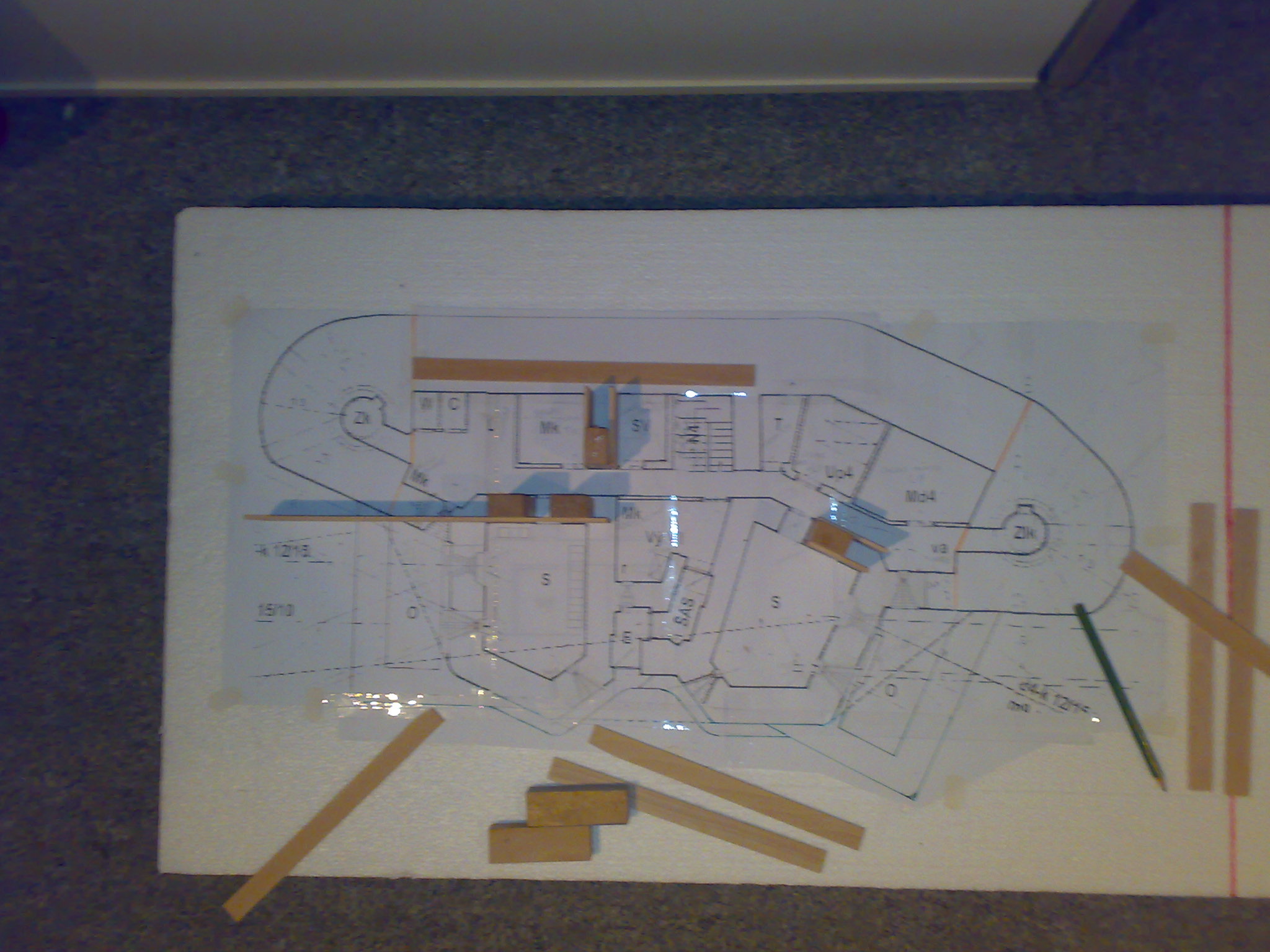 Zdravím, takže zjednoduším to: vybaven několika desítkami výkresů a materiálu jsem zvolna začal tvořit. Budu tu psat pokaždé jenom postup za určitý čas...teda jestli to nevadí...takže začal jsem vytisknutím výkresu(to byl horor) a nalepením na polystyren o tlouštce 10 cm...abych měl kam zapustit diamanťáky. Potom jsem vzal dřevěné destičky a hranolky (viz foto) a znich začal lepit vnitřní stěny...s tím budu pokračovat než takto nevylepím všechny stěny...takže příště pokračování.