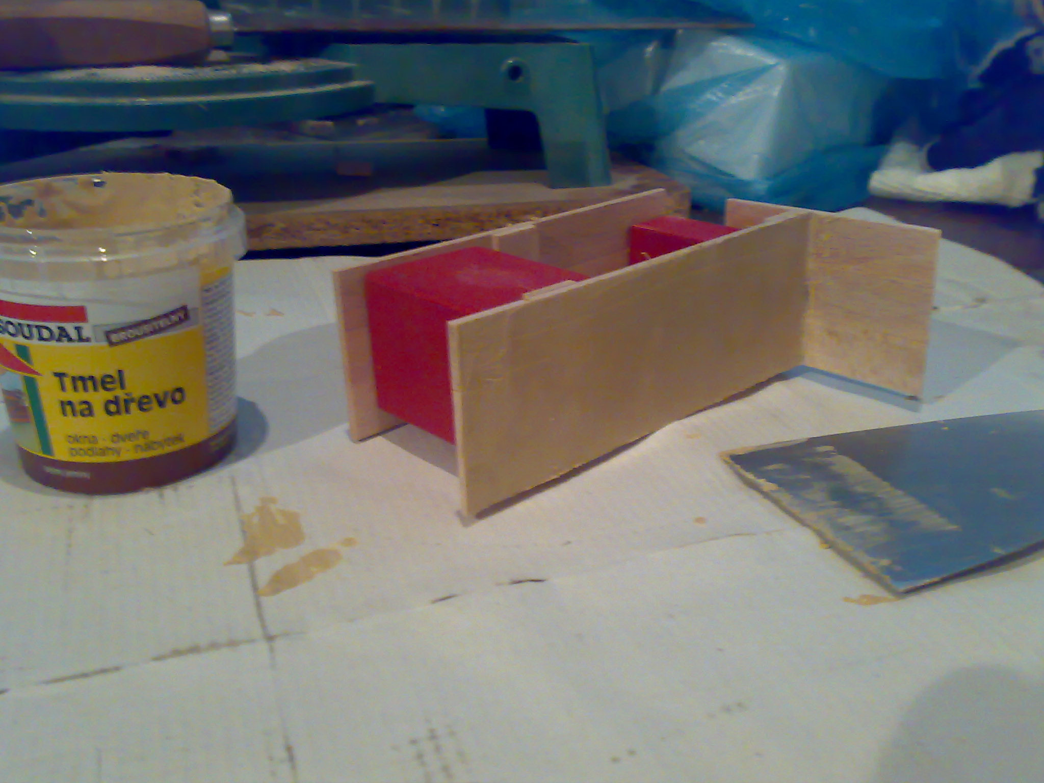 Zdravím, takže dnes jsem si koupil tmel na dřevo a začal jsem postupně tmelit vnitřní stěny...proč ptáte se? stěny jsou totiž zhotoveny ze dřeva a kdybych to natřel nějakou barvou prosvítaly by léta a další různé pruhy na dřevěných destičkách, po vytmelení a vybroušení není po takových nevzhlednostech ani památka.