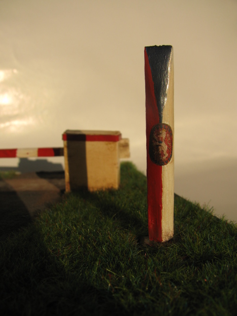 rád bych přispěl svým modelem hraničního přechodu se závorou Ippen a hraničním orientačním sloupem, v měřítku přibližně 1:40. Měl jsem to rozpracované asi půl roku, moc se mi do toho nechtělo, ale teď jsem byl nemocnej, tak jsem aspoň měl čas to dokončit. Pustil jsem si Sabaton a šel jsem na to. Základová deska je z polystyrenu, na ní jsem dal tmelící směs (chtěl jsem to vytkoušet, ale nebyl to dobrý nápad, protože se u okrajů začala zvedat), betonové části u závory a sloupu jsou ze sádry. Závora je ze čtvrtky, sloup z balzy. Tráva je koupená foliáž. Cestu jsme udělal ze strouhanky. Vždycky jsem chtěl zkusit tu trávu nějak natónovat, aby to vypadalo reálně asi nějakým washem, nebo jakou technikou by se to dalo, ale nikdy jsem si na to netrouf, abych to ještě víc nezkazil