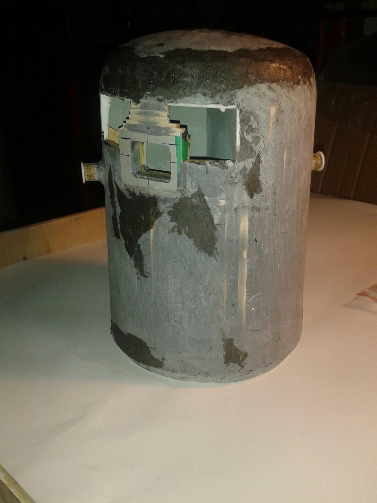 Šedý podstavec na kterém model stojí reprezentuje osazení ve zvonové šachtě resp. jeho zbývající šířku. Tedy šachta opravdu nebyla z nejširších a absence spodních manipulačních čepů je tedy zcela na místě.