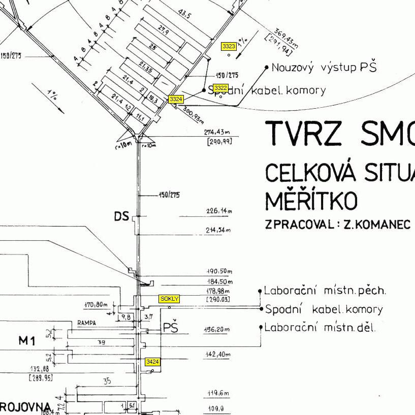 Vzdálenost podzemí mezi středem hlavní rozvětvující se odbočky pod dvojici objektů MO 38, 42 a kabelovou komorou s nouzovým východem č. 3324 v původní pracovní šachtě = 27,72 m.