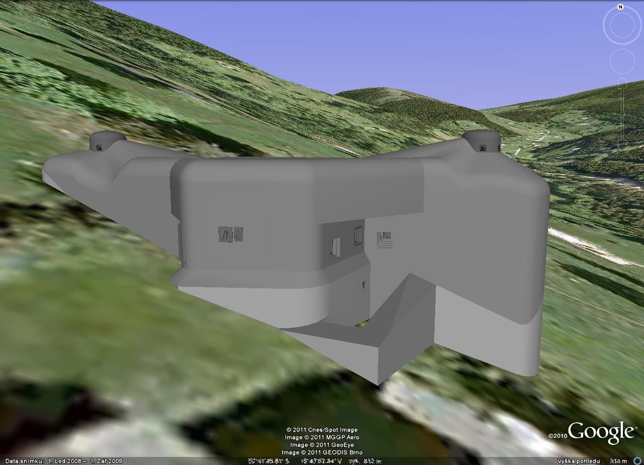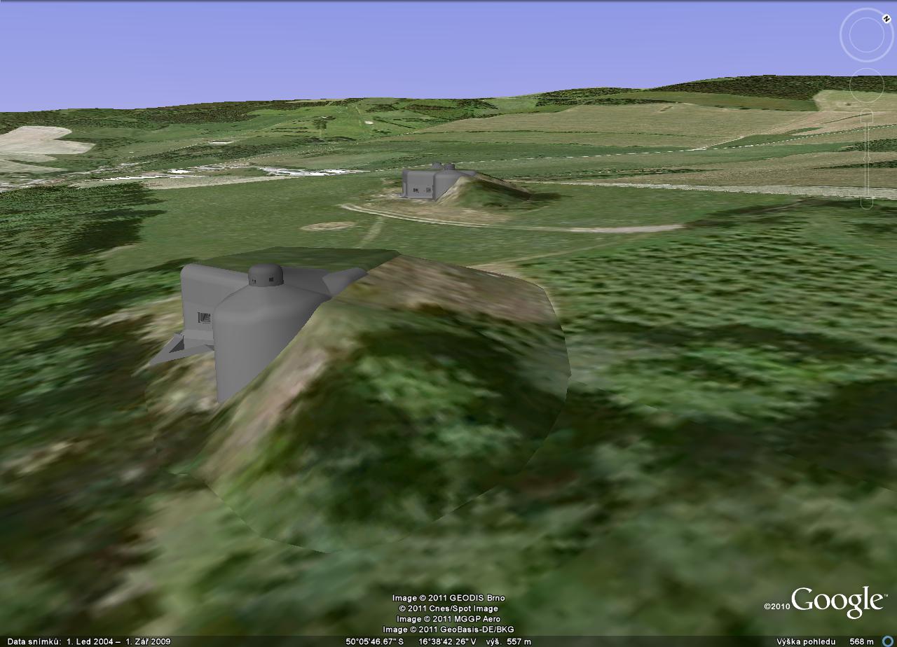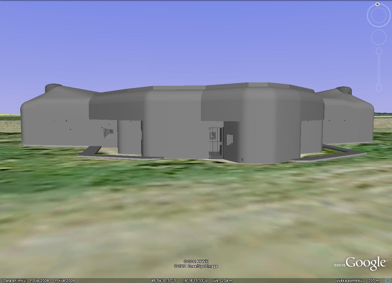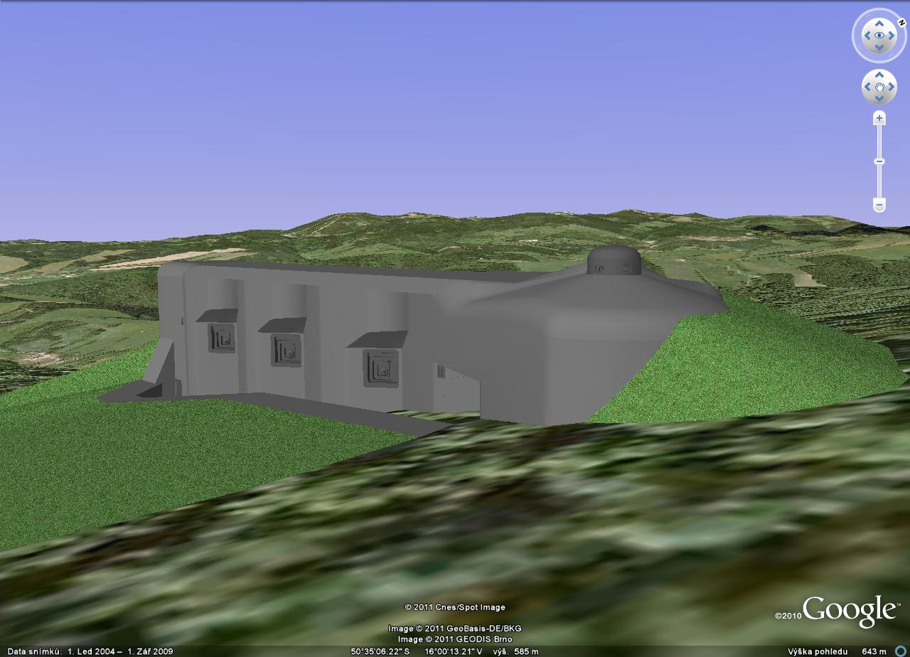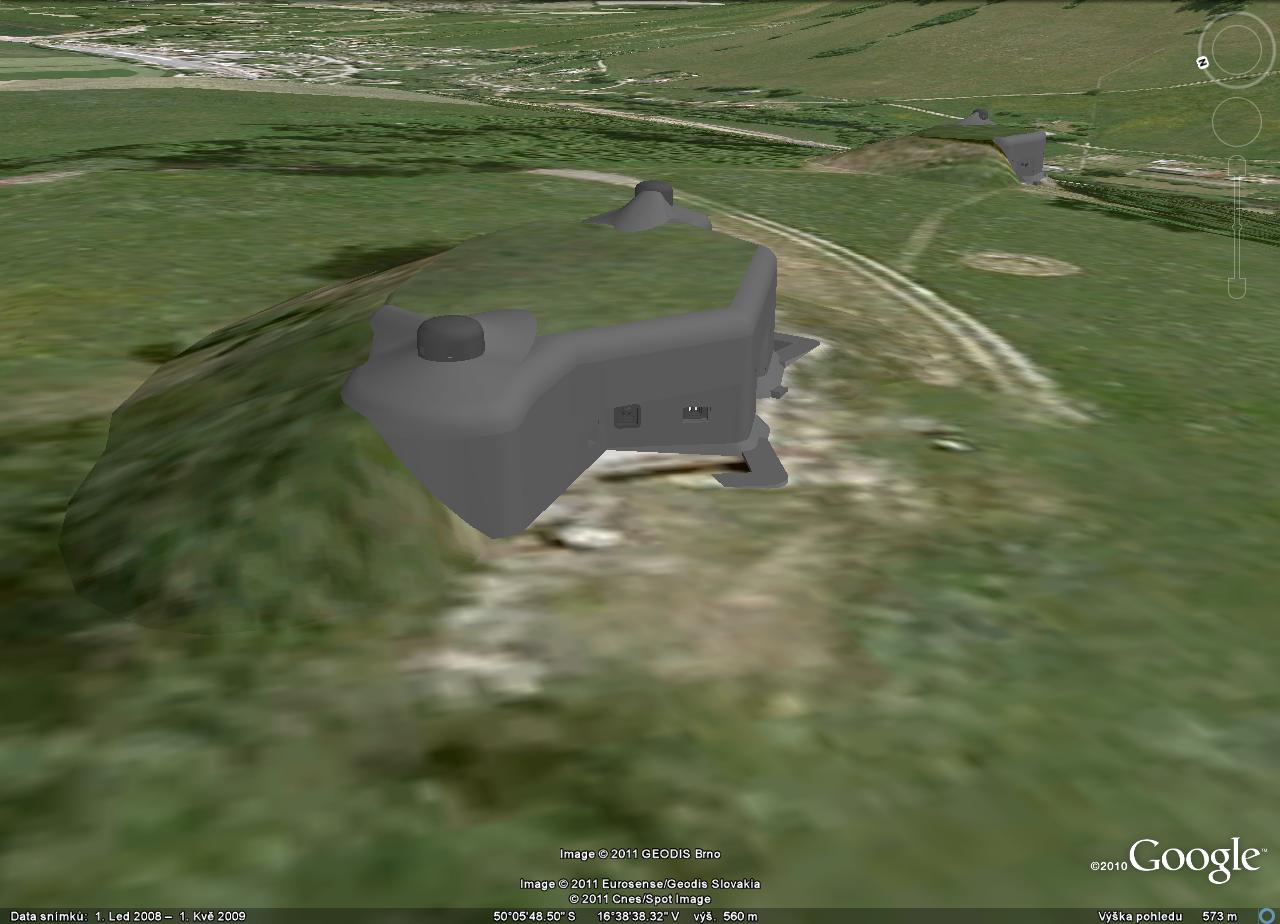 Takže dnes je na řadě MO-S 5. Ten si ovšem zaslouží 2 obrázky. Pravda ten násep GE trochu nezvládl, možná ho časem domodeluju ručně. Takhle ale zase vynikne ten podzemní tunel.Opevnění v Google Earth 3D