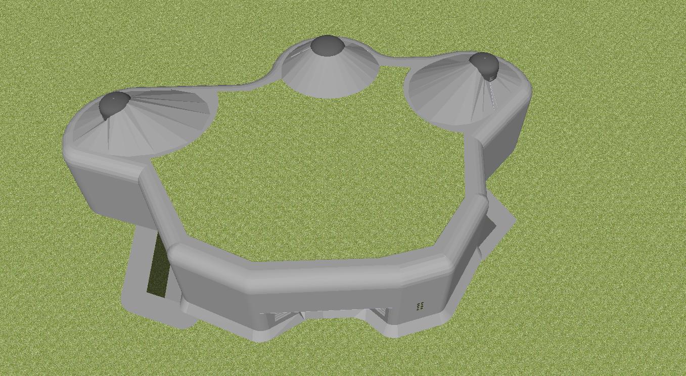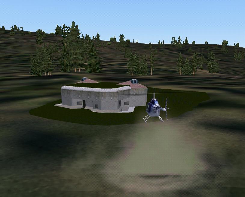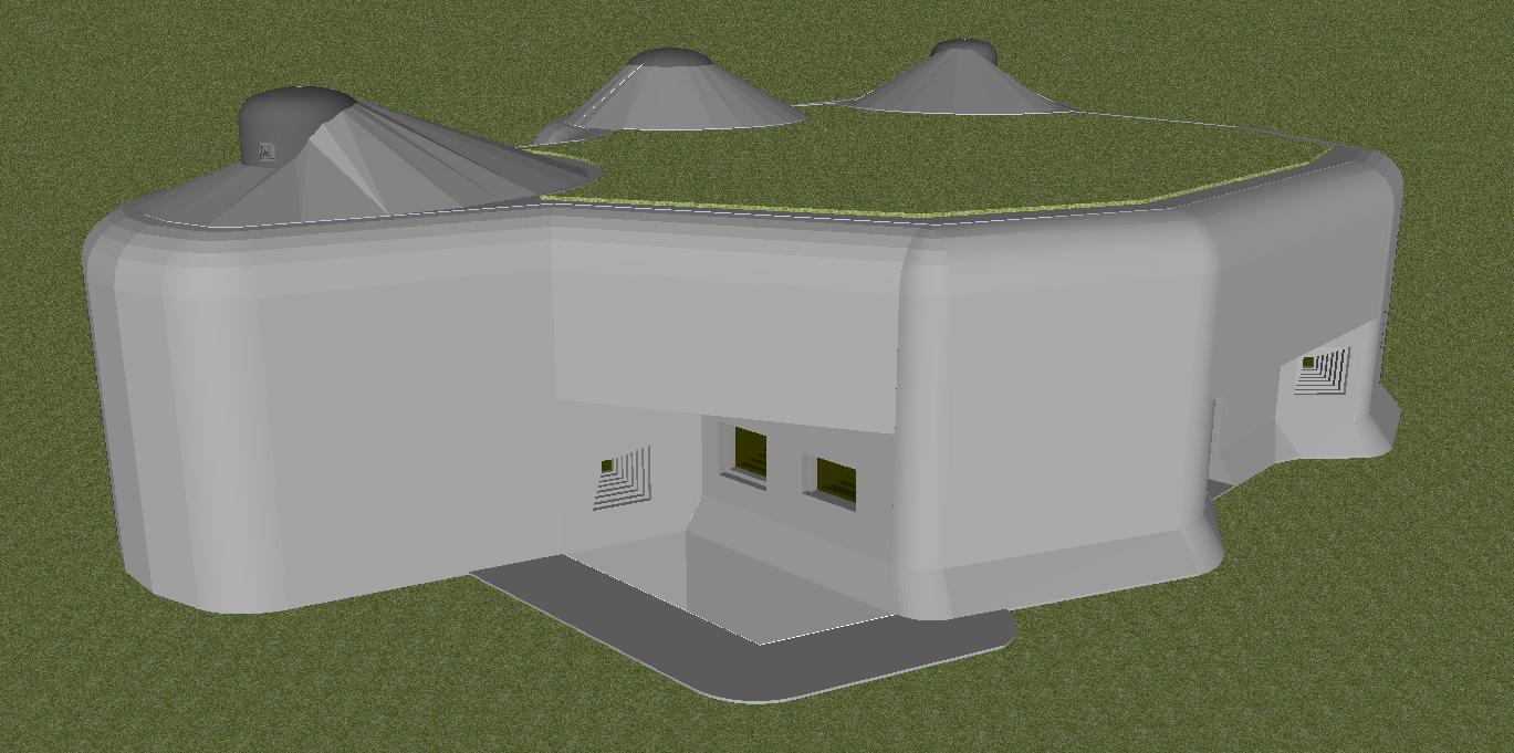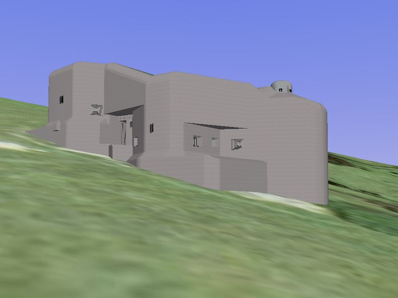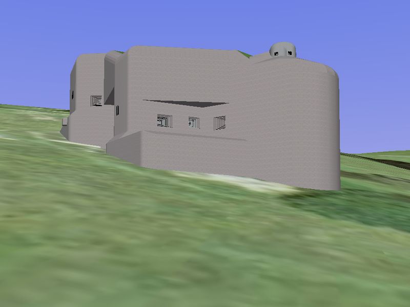 Jinak probémy s nemožností zobrazení příkopů a vůbec částí skrytých pod terénem jsem vyřešil snížením jejich hloubky a postavením objektu na mírný kopeček. Ne vždy to je ale ideální..