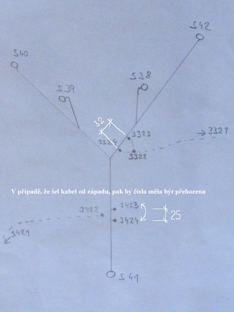 )Jaké mohly být odchylky měření?Myslím,že to pásmo je přesnější.Ta chyba je dost velká-vzdálenost mezi 3424 a 3423 by byla něco okolo 50m?No myslím,že v tuto chvíli to může potvrdit jedině Péťa,jestli ta nenapojená je na východ,nebo na západ.No vlastně měřil GPS na komorách tak by to mělo jít poznat z toho.V 3422 jsou instalovány všechny 3kabely a jsou tam pozůstatky po instalaci zařízení.3424 je natočena kabelovým vstupem k 3422,3424 má hák a asi 1 vstup zaizolovaný a 3423 má pravděpodobný vstup překryt vrstvou betonu,takže průzkum není možný.
