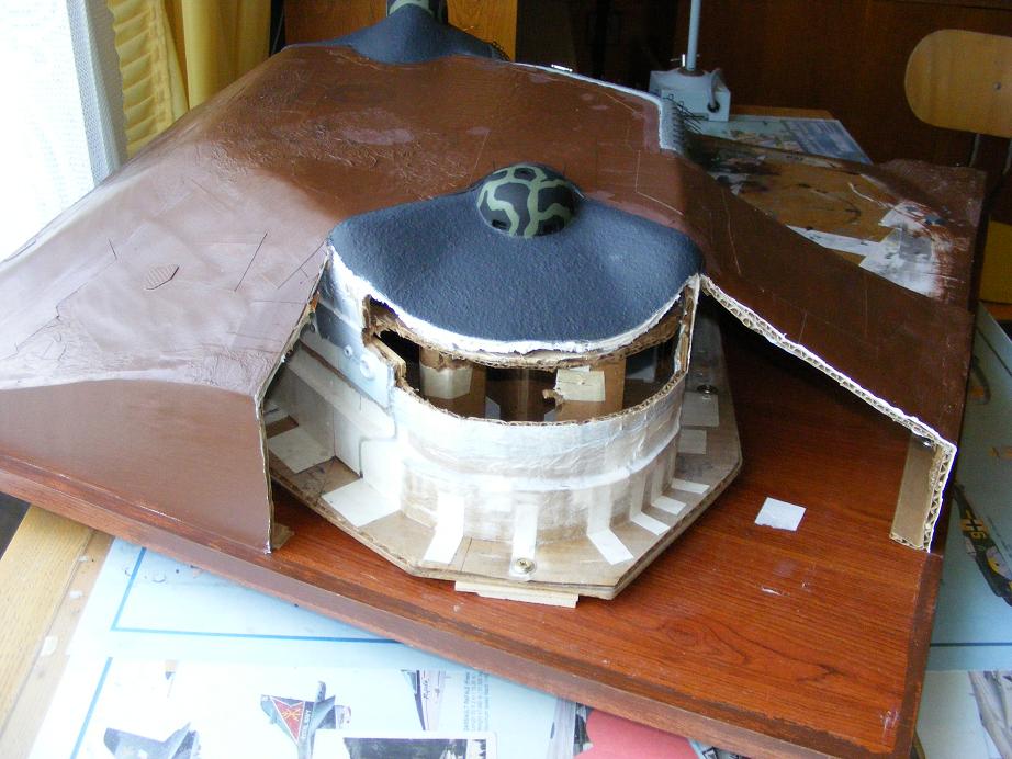 přetřu oba zvony a něco provedu s nepovedeným "opršením" týlové části zvonové šachty ZN. Zatím ale nevím co a jak... Po dovolené ještě přidám drobnosti jako jsou kamínky, trámky, zbytky různých prkýnek před vchodem. Uvažoval jsem o odstranění mříže ve vchodu a její nahrazení dřevěnými dvířky. V plánu bylo také dotažení terénu k okraji podkladové desky a její orámování dýhou. Na obojí jsem rezignoval.