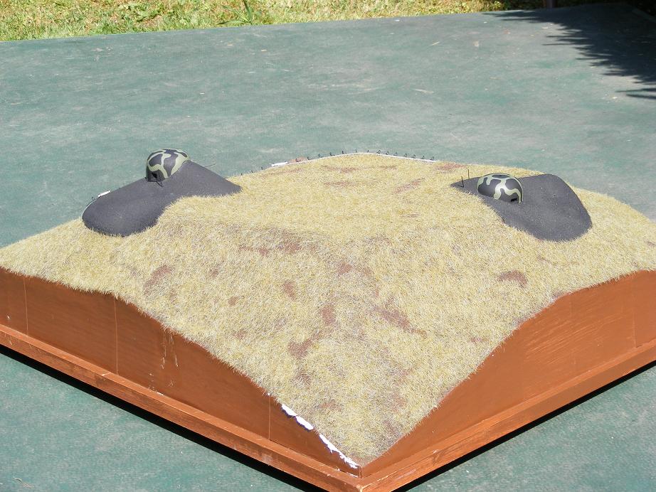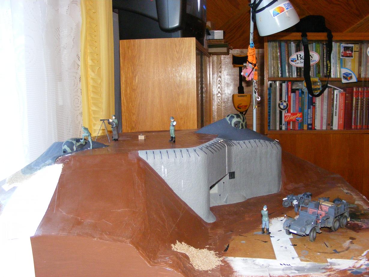 Opět jsem trochu popojel. Čas ale letí velmi rychle a boří veškeré mé odhady dokončení. Co jsem tedy oproti minule doplnil: dokončeny jsou 4 figury z 8, doplňky výstroje a technika. Povrch modelu jsem zkusmo posypal směsí přesáté hlíny a písku (lepeno na Herkules). Předpokládal jsem, že se tím zcela ztratí spoje papíru na terénu. Jedna vrstva bude ale málo, takže asi dám ještě jednu.