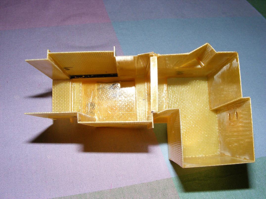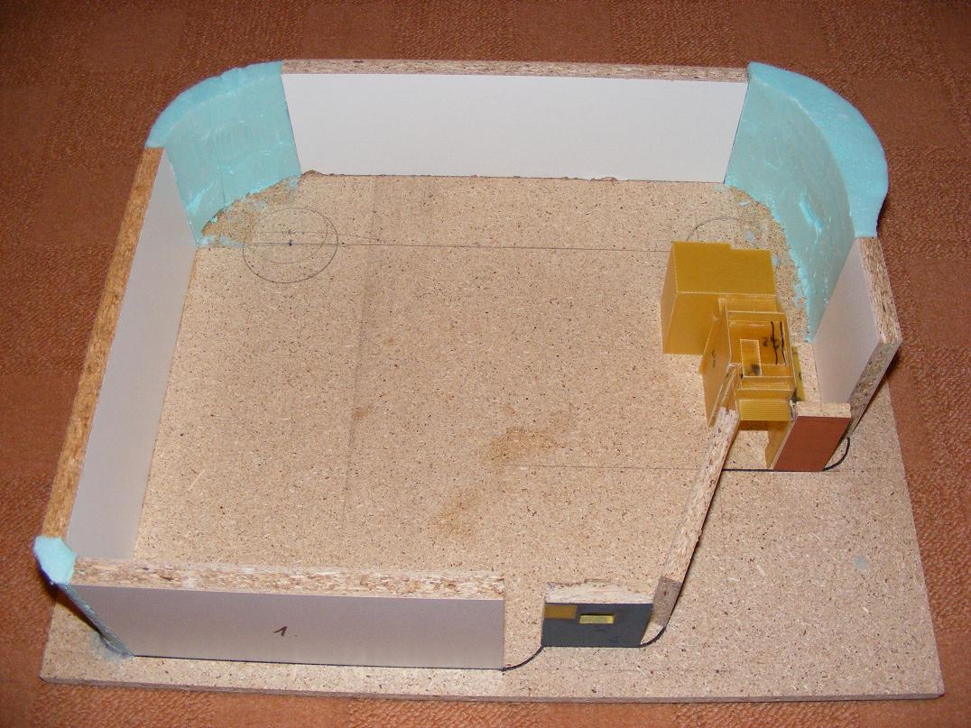 Letos nám zateplovali panelák, takže jsem si nabral dost polystyrenu. Na terén to bude stačit a ten zbytek uvidíme. Zelený polystyren je mnohem tvrdší a má jemnější strukturu. Napadlo mě vyřezat z něj celý objekt. Naštěstí ho ale tolik nemám, takže stavím z dřevotřísky a lamina. Jediný papír plánuji na polepení objektu pro zpevnění, než ho budu tmelit karosářským tmelem. Bude to oblíbená metoda toaletní papír na herkules.