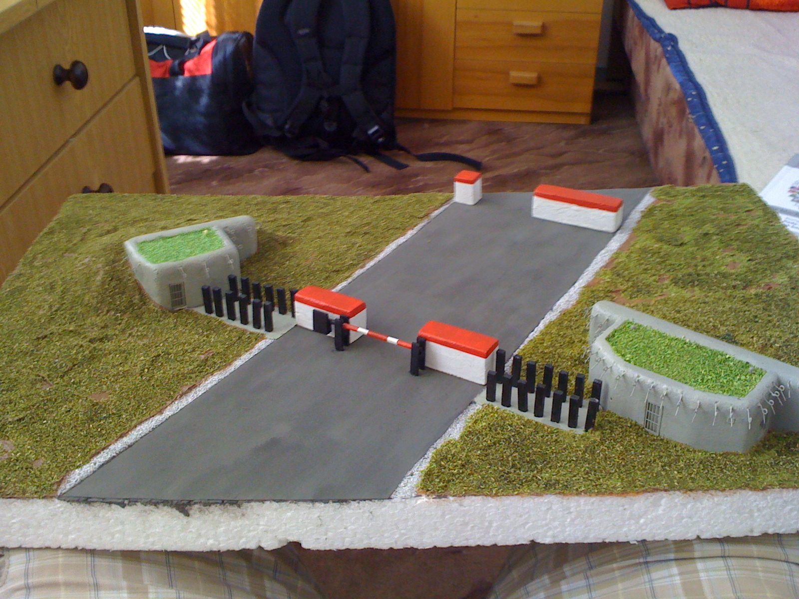 No v současné době jsem si rozpracoval model na podkladu 50x34cm(polystyren). Je to větší ale chci to zkusit. Bude tam silnice o délce 34cm (tu jsme znázornil nalepením smirkového papíru na polystyrenovou podložku, posléze plánuji natřít smirk nějakým odstínem šedé) asi 4cm od pravého kraje podkladu. Na té si připravuji přehrazení v podobě závory ippen (s krycí zídkou na každé straně) a jednu přehrazovací zídku asi 13cm před závoru. V současné době řeším problém z čeho tu závoru vyrobit. Na samotnou závoru dle rozměrů sedí i párátko, ale první výroba nosníků závory z nastříhaného plechu nedopadla vůbec dobře :-D.