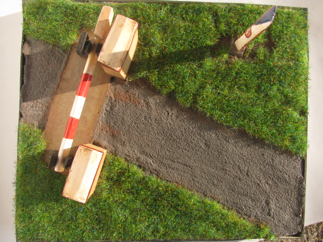 rád bych přispěl svým modelem hraničního přechodu se závorou Ippen a hraničním orientačním sloupem, v měřítku přibližně 1:40. Měl jsem to rozpracované asi půl roku, moc se mi do toho nechtělo, ale teď jsem byl nemocnej, tak jsem aspoň měl čas to dokončit. Pustil jsem si Sabaton a šel jsem na to. Základová deska je z polystyrenu, na ní jsem dal tmelící směs (chtěl jsem to vytkoušet, ale nebyl to dobrý nápad, protože se u okrajů začala zvedat), betonové části u závory a sloupu jsou ze sádry. Závora je ze čtvrtky, sloup z balzy. Tráva je koupená foliáž. Cestu jsme udělal ze strouhanky. Vždycky jsem chtěl zkusit tu trávu nějak natónovat, aby to vypadalo reálně asi nějakým washem, nebo jakou technikou by se to dalo, ale nikdy jsem si na to netrouf, abych to ještě víc nezkazil