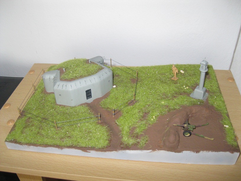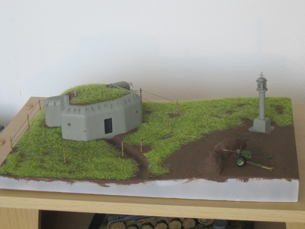 . Kde se vlastně vzalo to kvantum hlíny před dělem? Taky jsme si dávali bokem drny z vrchní vrstvy a pak je umístili na hliněný val ze strany k nepříteli, tak aby nás nebylo hned vidět a trvalo to dýl, než umřem. No a jako modelář bych přidal šutr pod granátový skluz, aby říšská branná moc nepřišla zkrátka, taky bych zahustil (přidal sloupky) překážku okolo řopu, tahle mi to trochu připomíná výběh. Ještě bych tu překážku udělal v klasickém tvaru bez ohledu na tvar podložky i za cenu jejího přerušení.