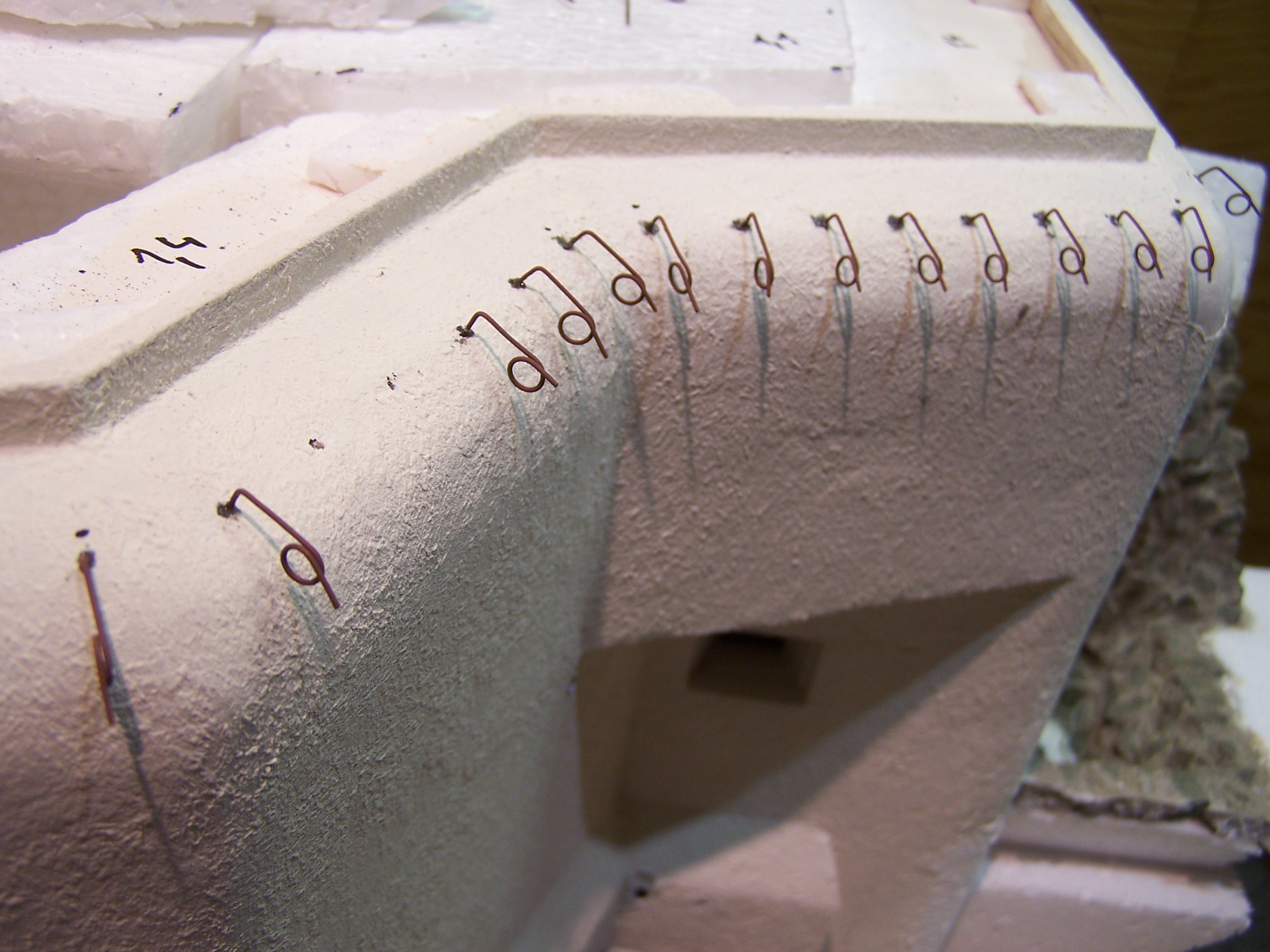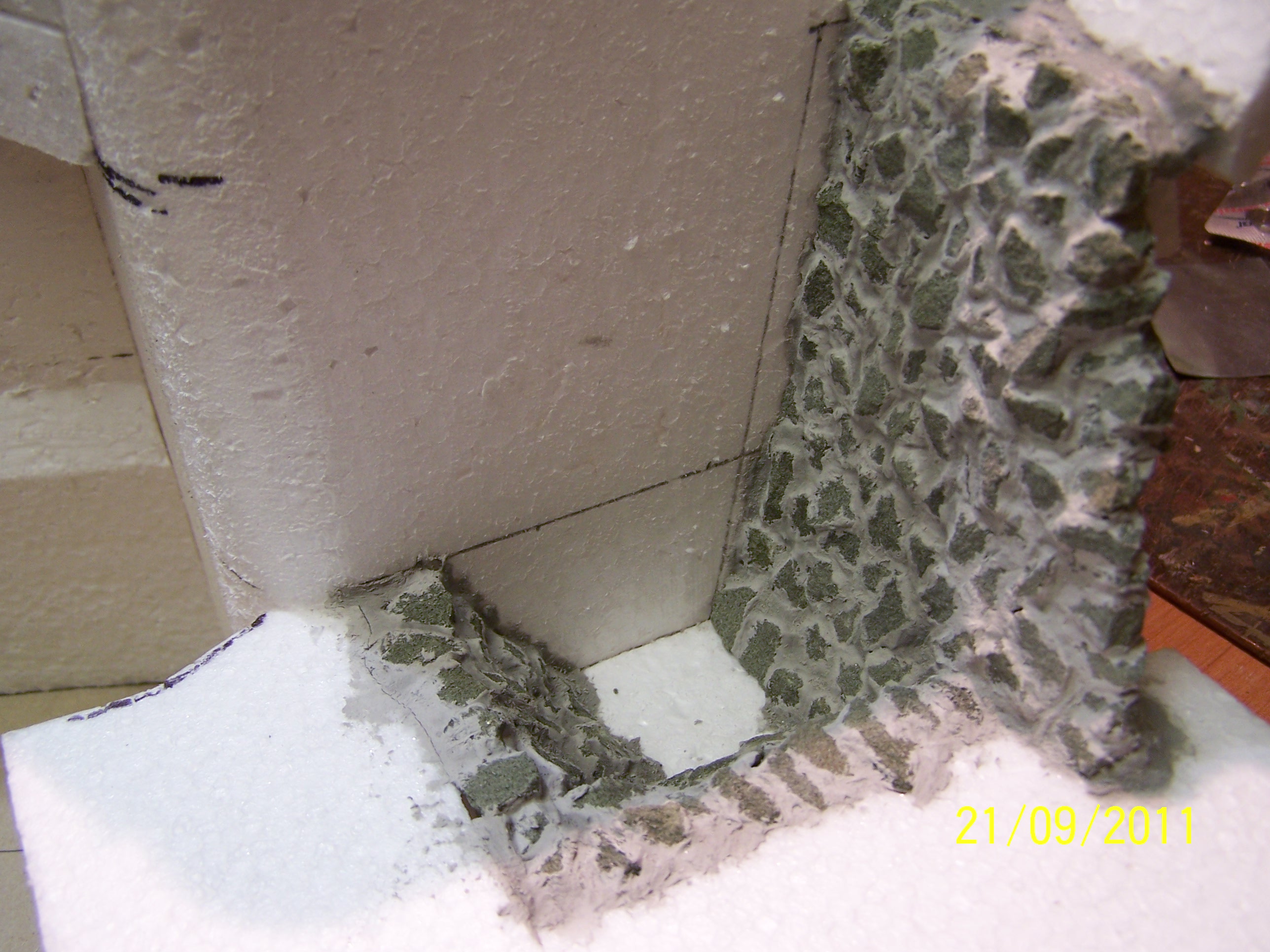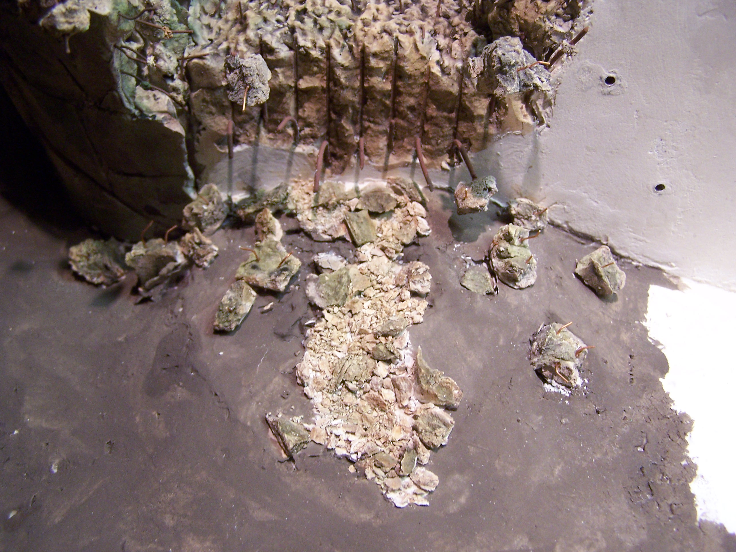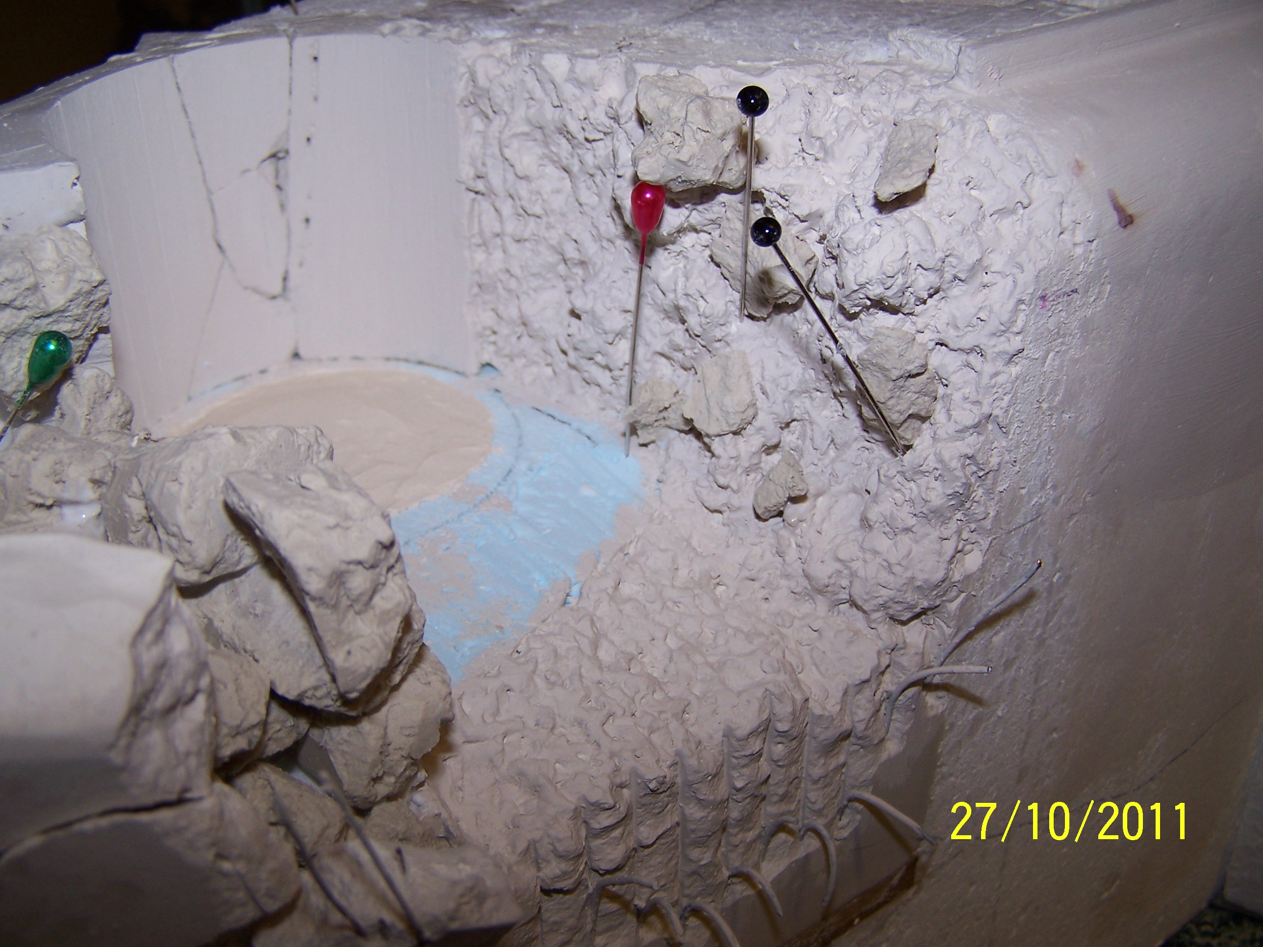 Při sádrování části ucha,kreré bylo trháním vyhnuté směrem mimo půdorys srubu,jsem do polystyrénu vlepil měděné dráty asi 1mm silné-34foto.Potom jsem si z hliníkového plechu vytvořil vnější "šalování". Dráty zalil sádrou a vytvořil tak vnější stěnu ucha.Zbývalo ji jen rychle nalámat než sádra vytvrdne.Zasádrovaný měděný drát drží trosky pohromadě a dokázal povolit tak že se stěna ucha vyklopila.Po vyschnutí sádry jsem trosky zevnitř polepil lepidlem. Stěna pak byla pevná a udržela ostatní kusy "betonu"-.Přilepované kusy betonu jsem si nalámal ze sádry, kterou jsem si odlil do asi 1 cm silné desky.Trčící armovací "železo" je měděný drát silný asi 0,5mm.Na každý drátek jsem musel vyvrtat díru ,aby mi při lepení drátky nepadávaly-43foto.