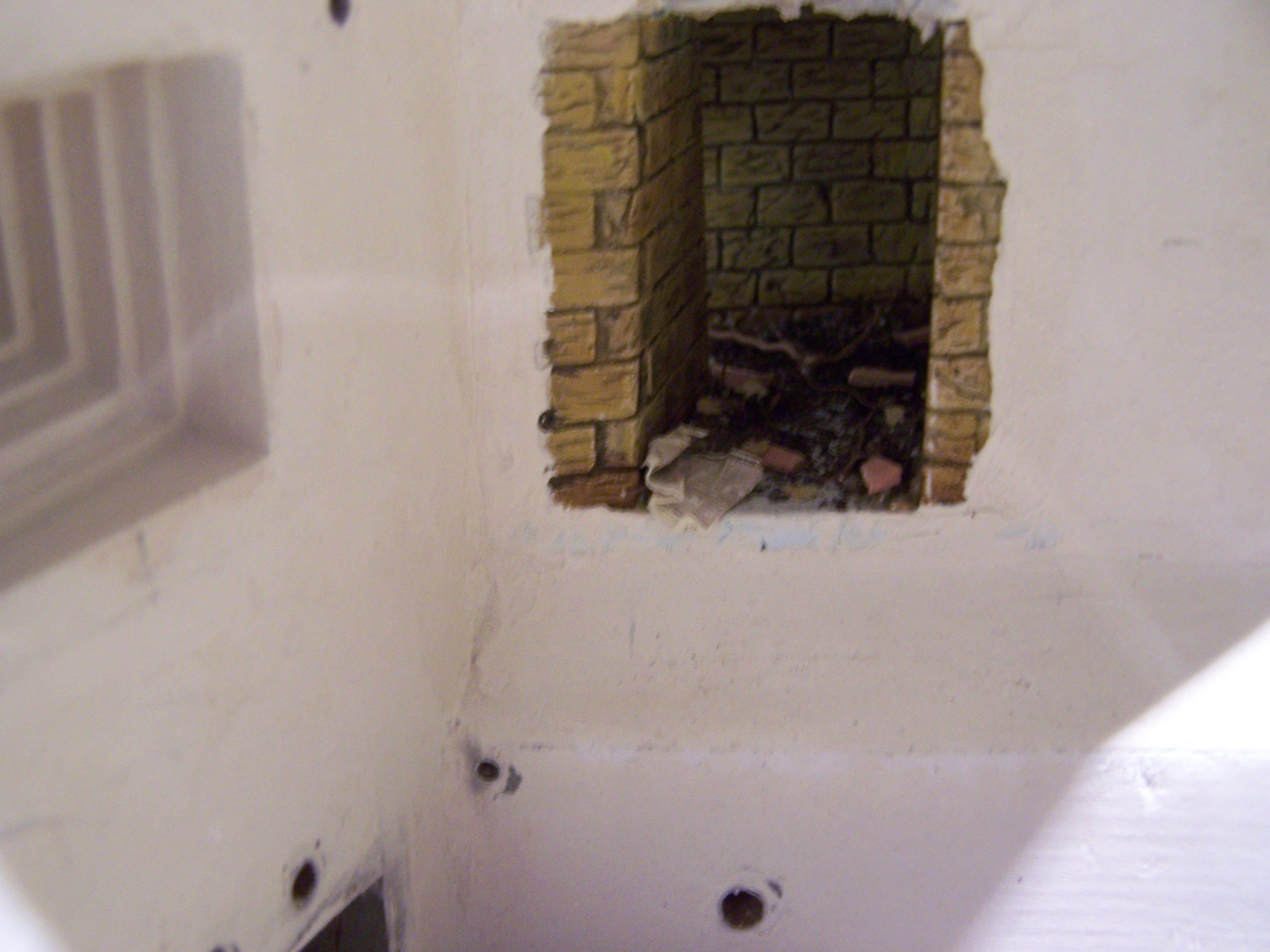 Betonové ucho je vymodelované z obyčejné sádry,postup jsem zvolil ten, že v místě zvonu jsem usadil vybetonovanou čát zvonové šachty, která byla trháním nepoškozena.Tu jsem si odlil do kovové formy.Po usazení a přilepení jsem vylepil polystyrénem"záda" trhaného betonu-30foto, aby váha sádry byla co nejmenší a model tak nevážil to co originál.Vytvořil jsem tak jakousi formu, k sádrování jsem musel model otočit o 90 stupňů aby mi sádra nestíkala,po zatuhnutí sádry jsem rydly vyrýval stopy po zbíječkách-33foto.Práce musela proběhnout co nejrychleji než sádra úplně vytvrdne,protože pak je sádra hodně tvrdá a "štípe se".Při konečném barvení by pak bylo poznat jak tvrdá sádra při rytí byla.Dalo by se v sádře rýpat i po vytvrzení ale povrch by nebyl stejný a pracnost o dost větší.Na přední staně v místě kde se zvon vytahoval,jsem před sádrováním přilepil do polystyrénové formy smrkovou lištu asi 8x8mm do které jsem předtím vlepil pozinkované dráty o průměru 1mm-29foto.To celé jsem zalil sádrou, tak aby při tahu za dráty směrem ven ze srubu odpadly kousky sádry a drát se ohnul tak jako byl ve skutečnosti-31foto.