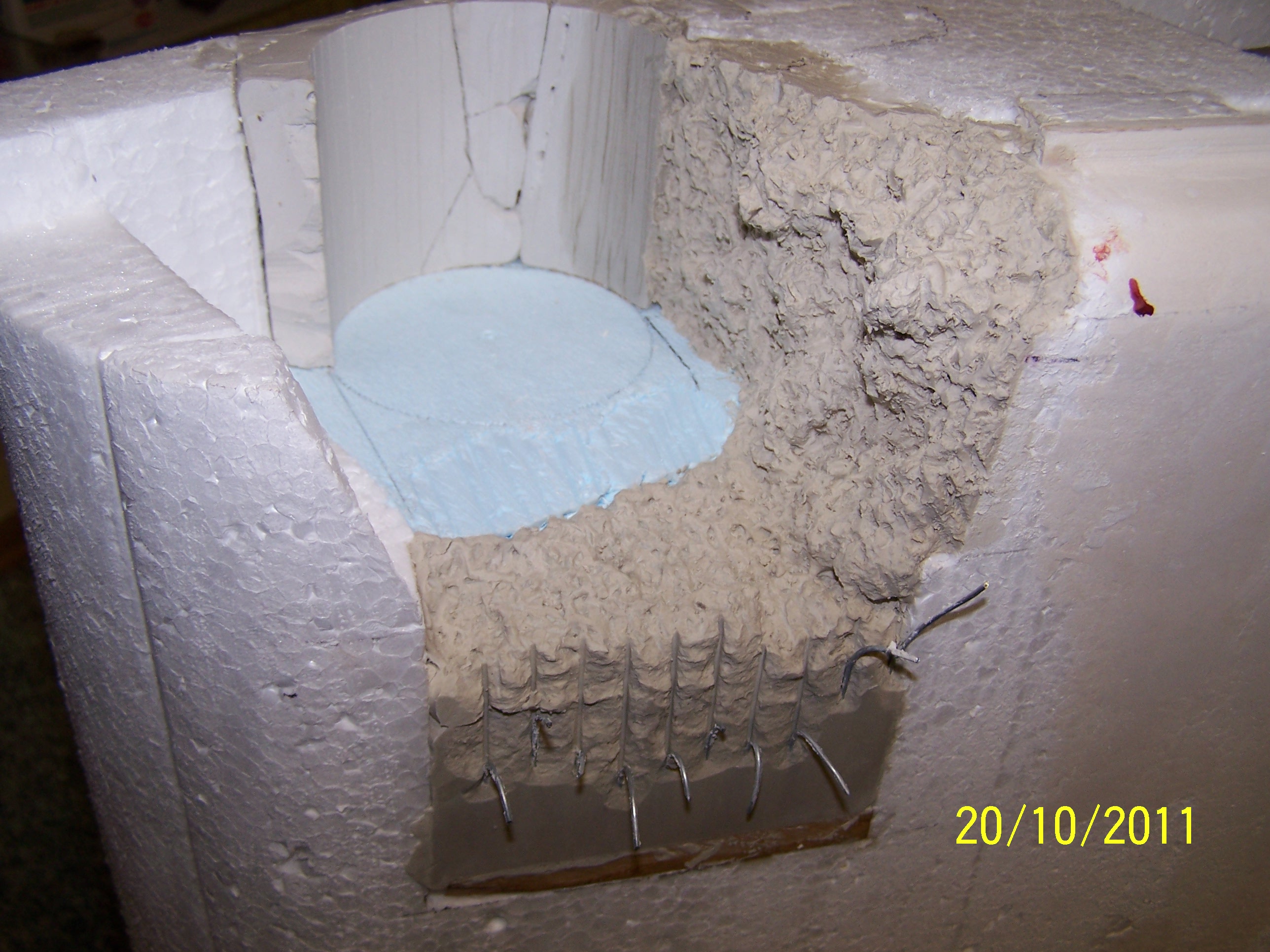 Při sádrování části ucha,kreré bylo trháním vyhnuté směrem mimo půdorys srubu,jsem do polystyrénu vlepil měděné dráty asi 1mm silné-34foto.Potom jsem si z hliníkového plechu vytvořil vnější "šalování". Dráty zalil sádrou a vytvořil tak vnější stěnu ucha.Zbývalo ji jen rychle nalámat než sádra vytvrdne.Zasádrovaný měděný drát drží trosky pohromadě a dokázal povolit tak že se stěna ucha vyklopila.Po vyschnutí sádry jsem trosky zevnitř polepil lepidlem. Stěna pak byla pevná a udržela ostatní kusy "betonu"-.Přilepované kusy betonu jsem si nalámal ze sádry, kterou jsem si odlil do asi 1 cm silné desky.Trčící armovací "železo" je měděný drát silný asi 0,5mm.Na každý drátek jsem musel vyvrtat díru ,aby mi při lepení drátky nepadávaly-43foto.