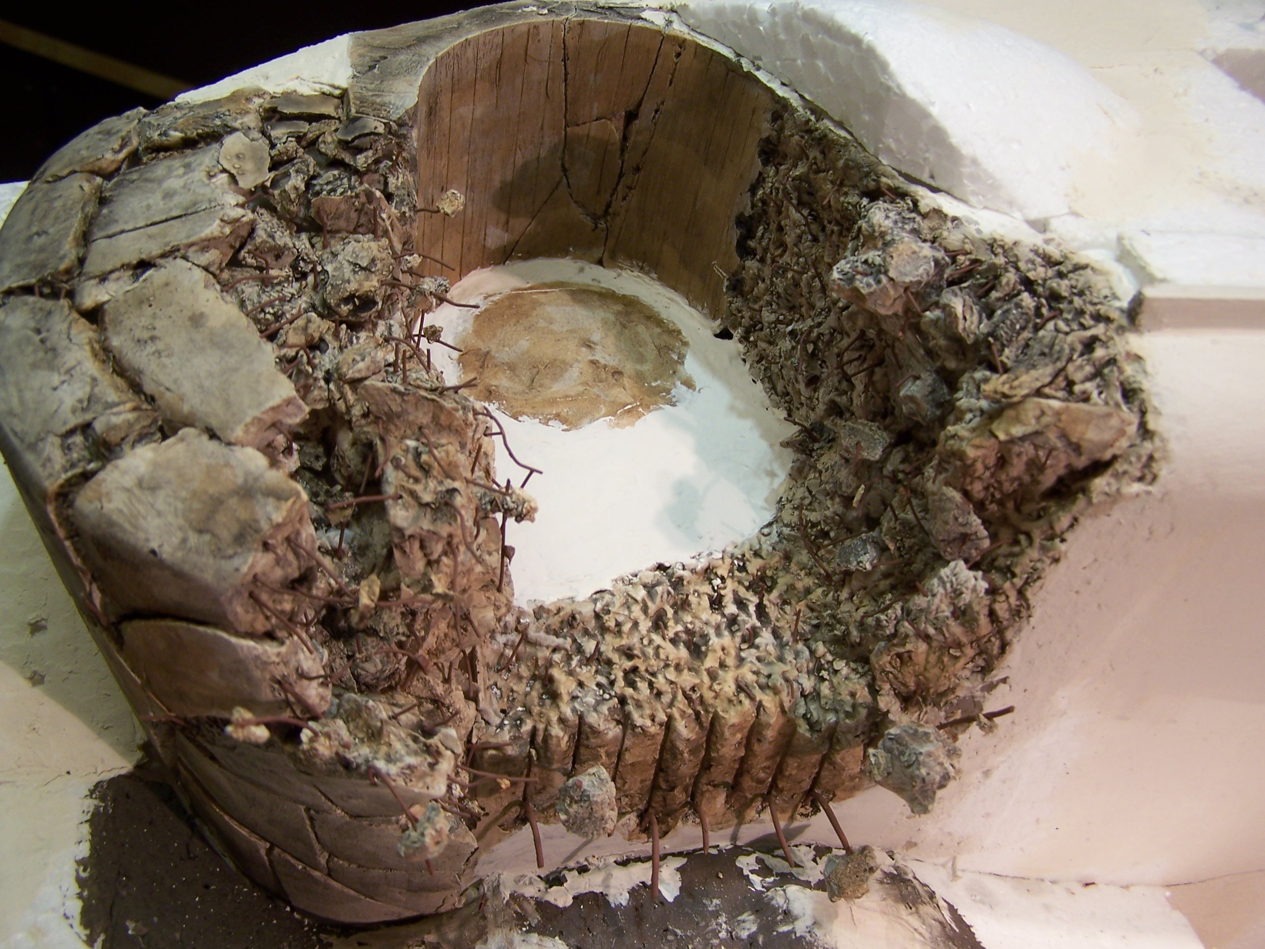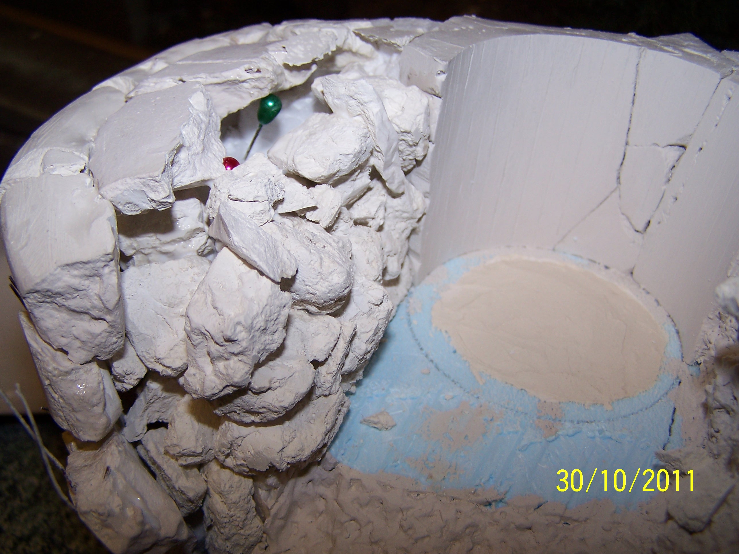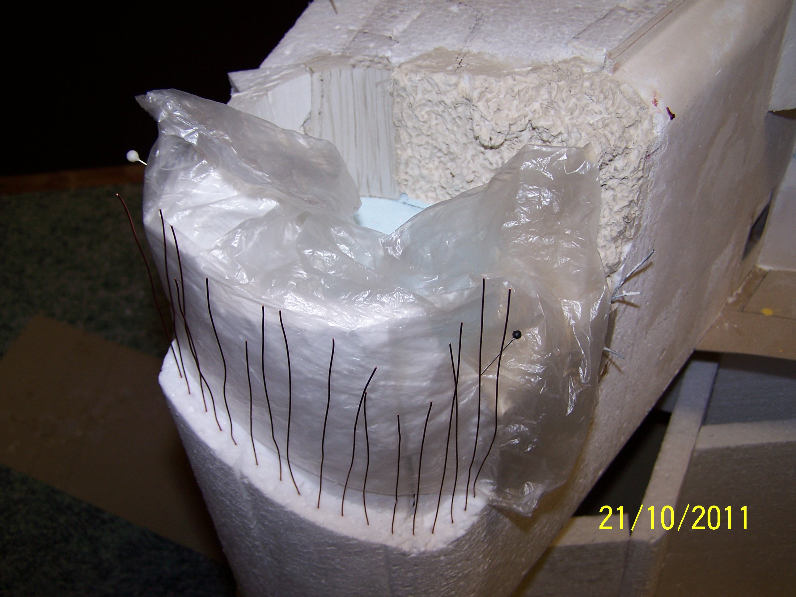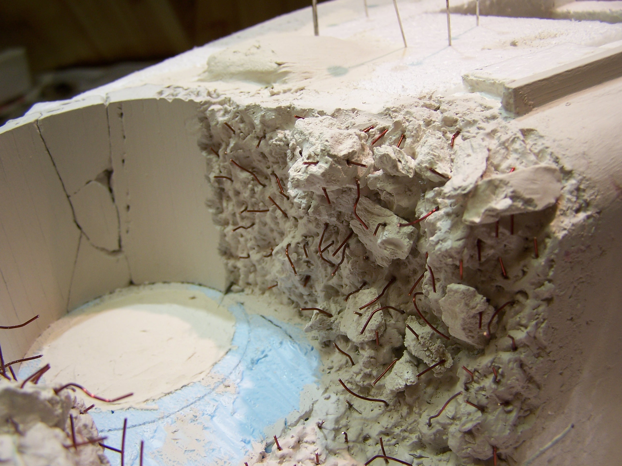 Při sádrování části ucha,kreré bylo trháním vyhnuté směrem mimo půdorys srubu,jsem do polystyrénu vlepil měděné dráty asi 1mm silné-34foto.Potom jsem si z hliníkového plechu vytvořil vnější "šalování". Dráty zalil sádrou a vytvořil tak vnější stěnu ucha.Zbývalo ji jen rychle nalámat než sádra vytvrdne.Zasádrovaný měděný drát drží trosky pohromadě a dokázal povolit tak že se stěna ucha vyklopila.Po vyschnutí sádry jsem trosky zevnitř polepil lepidlem. Stěna pak byla pevná a udržela ostatní kusy "betonu"-.Přilepované kusy betonu jsem si nalámal ze sádry, kterou jsem si odlil do asi 1 cm silné desky.Trčící armovací "železo" je měděný drát silný asi 0,5mm.Na každý drátek jsem musel vyvrtat díru ,aby mi při lepení drátky nepadávaly-43foto.