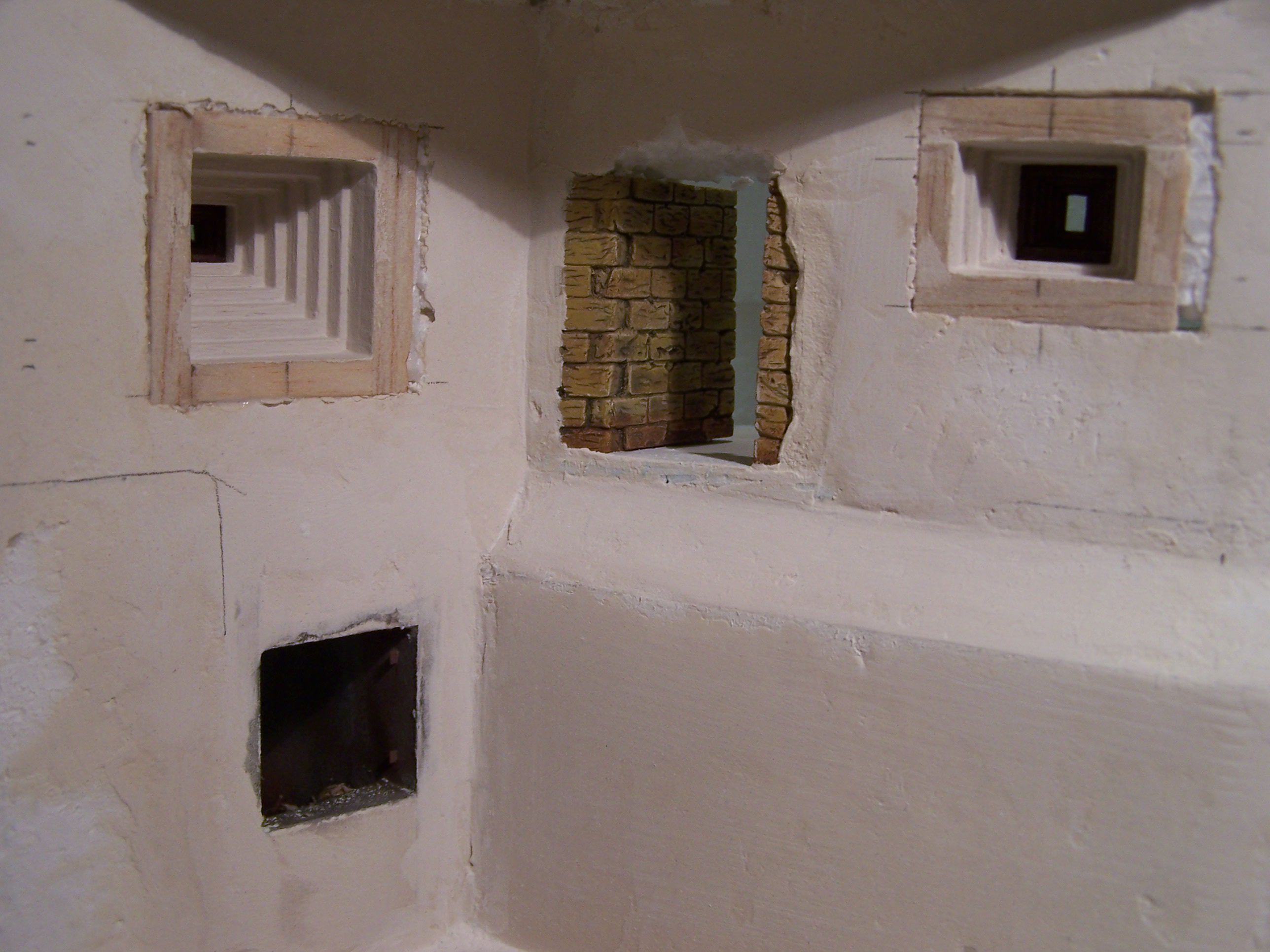 Betonové ucho je vymodelované z obyčejné sádry,postup jsem zvolil ten, že v místě zvonu jsem usadil vybetonovanou čát zvonové šachty, která byla trháním nepoškozena.Tu jsem si odlil do kovové formy.Po usazení a přilepení jsem vylepil polystyrénem"záda" trhaného betonu-30foto, aby váha sádry byla co nejmenší a model tak nevážil to co originál.Vytvořil jsem tak jakousi formu, k sádrování jsem musel model otočit o 90 stupňů aby mi sádra nestíkala,po zatuhnutí sádry jsem rydly vyrýval stopy po zbíječkách-33foto.Práce musela proběhnout co nejrychleji než sádra úplně vytvrdne,protože pak je sádra hodně tvrdá a "štípe se".Při konečném barvení by pak bylo poznat jak tvrdá sádra při rytí byla.Dalo by se v sádře rýpat i po vytvrzení ale povrch by nebyl stejný a pracnost o dost větší.Na přední staně v místě kde se zvon vytahoval,jsem před sádrováním přilepil do polystyrénové formy smrkovou lištu asi 8x8mm do které jsem předtím vlepil pozinkované dráty o průměru 1mm-29foto.To celé jsem zalil sádrou, tak aby při tahu za dráty směrem ven ze srubu odpadly kousky sádry a drát se ohnul tak jako byl ve skutečnosti-31foto.