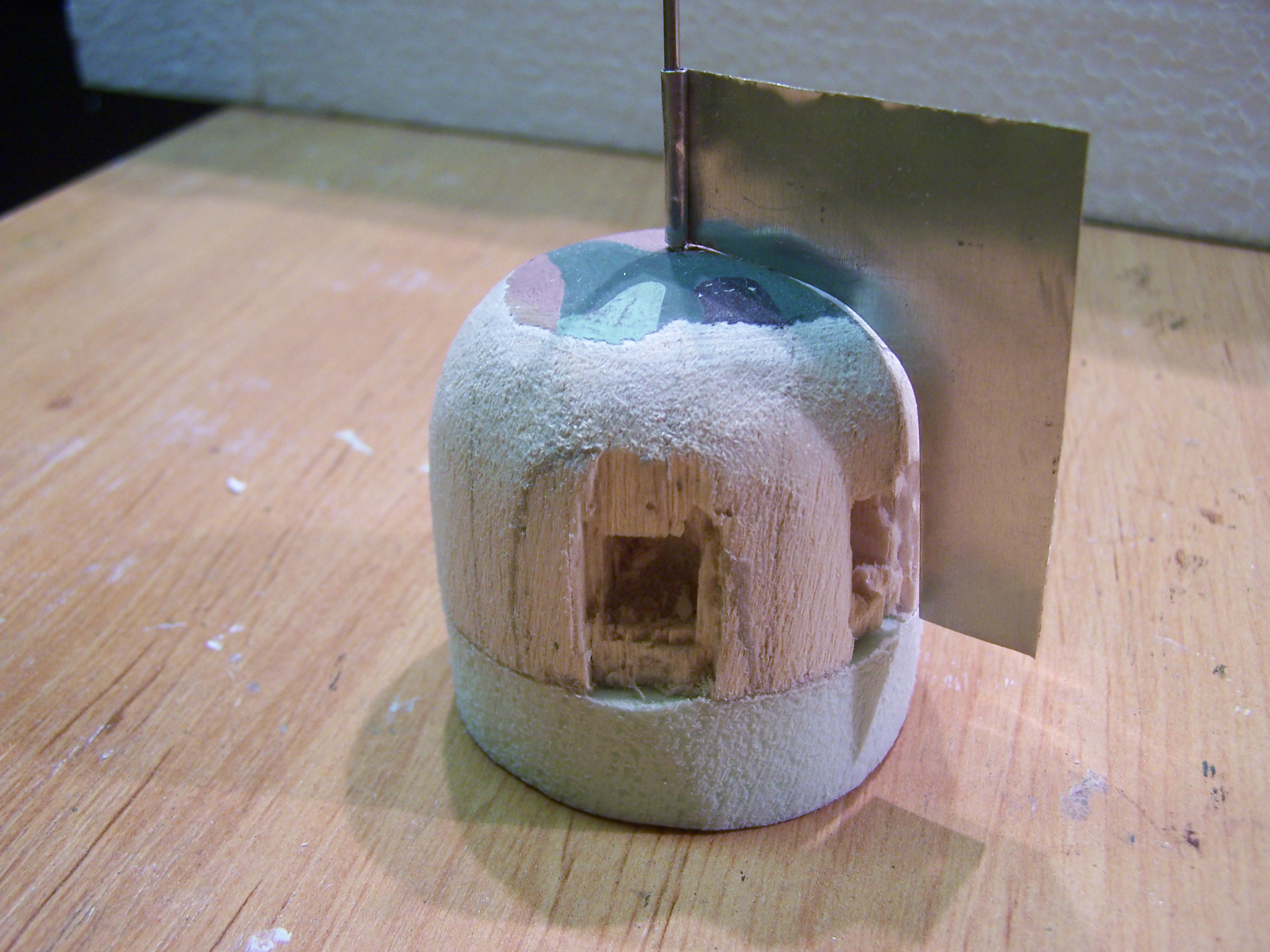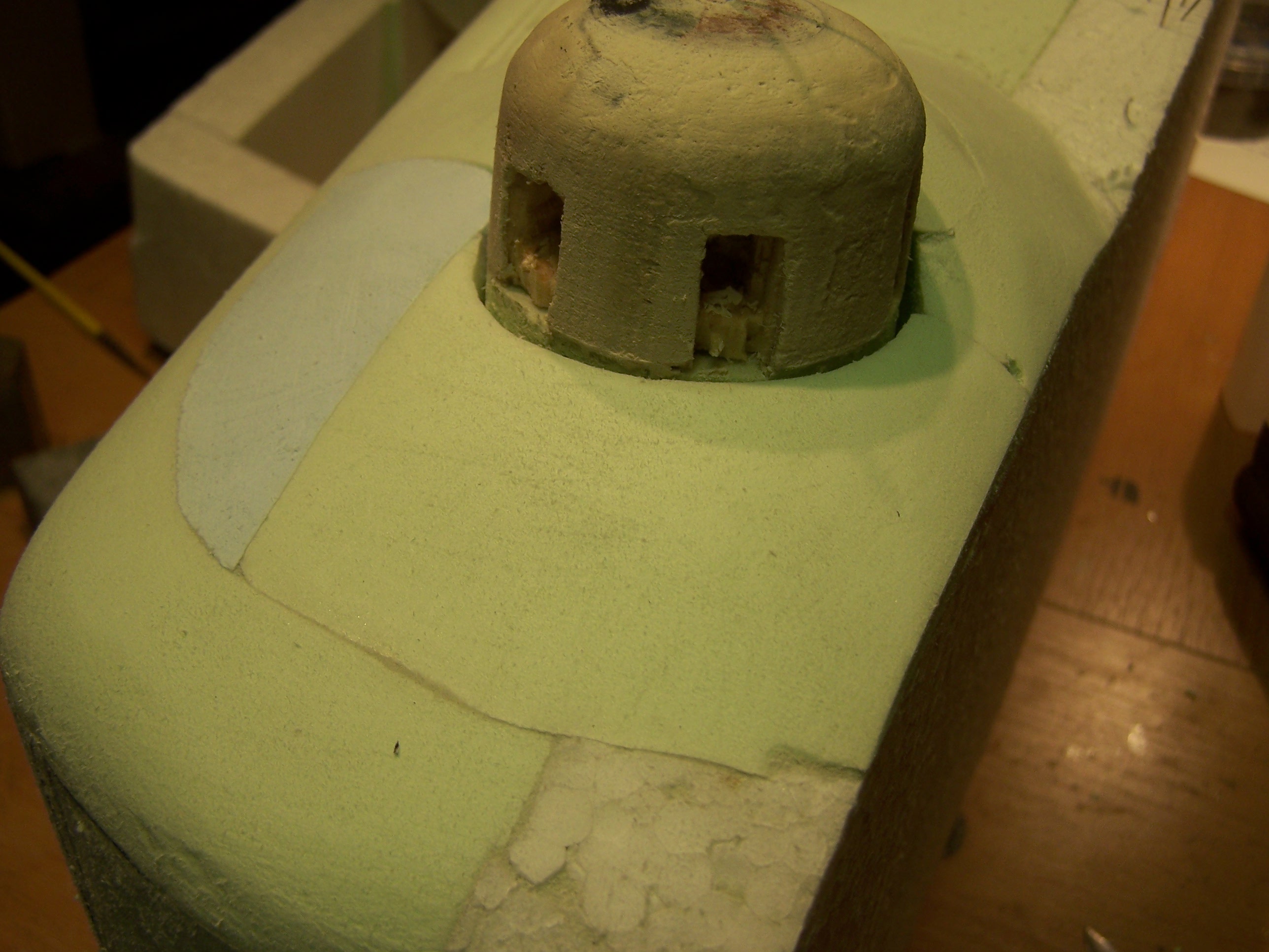 Toš aji tak sa dá, ale je to příliš kostrbatý způsob cesty k cíli. Myslím tím dosažení tvaru zvonu a střílen, Jinak se mi zdá, že vzdálenost mezi střílnou zbraně Q a D je příliš malá. U srububu MO-S5 činila 230 cm, místo obvyklých 210cm, protože mezi oběma střílnami byla cihelná příčka tloušťky 30 cm. Jinak se mi samozřejmě líbí práce s charakterem materiálů a důraz na detail. Další připomínka se týká ještě zbarvení čelní desky ve střílně Q, kde je nutné předpokládat odstín světlešedé barvy v tónu slonové kosti jak uvádí předpisy fy Škoda.