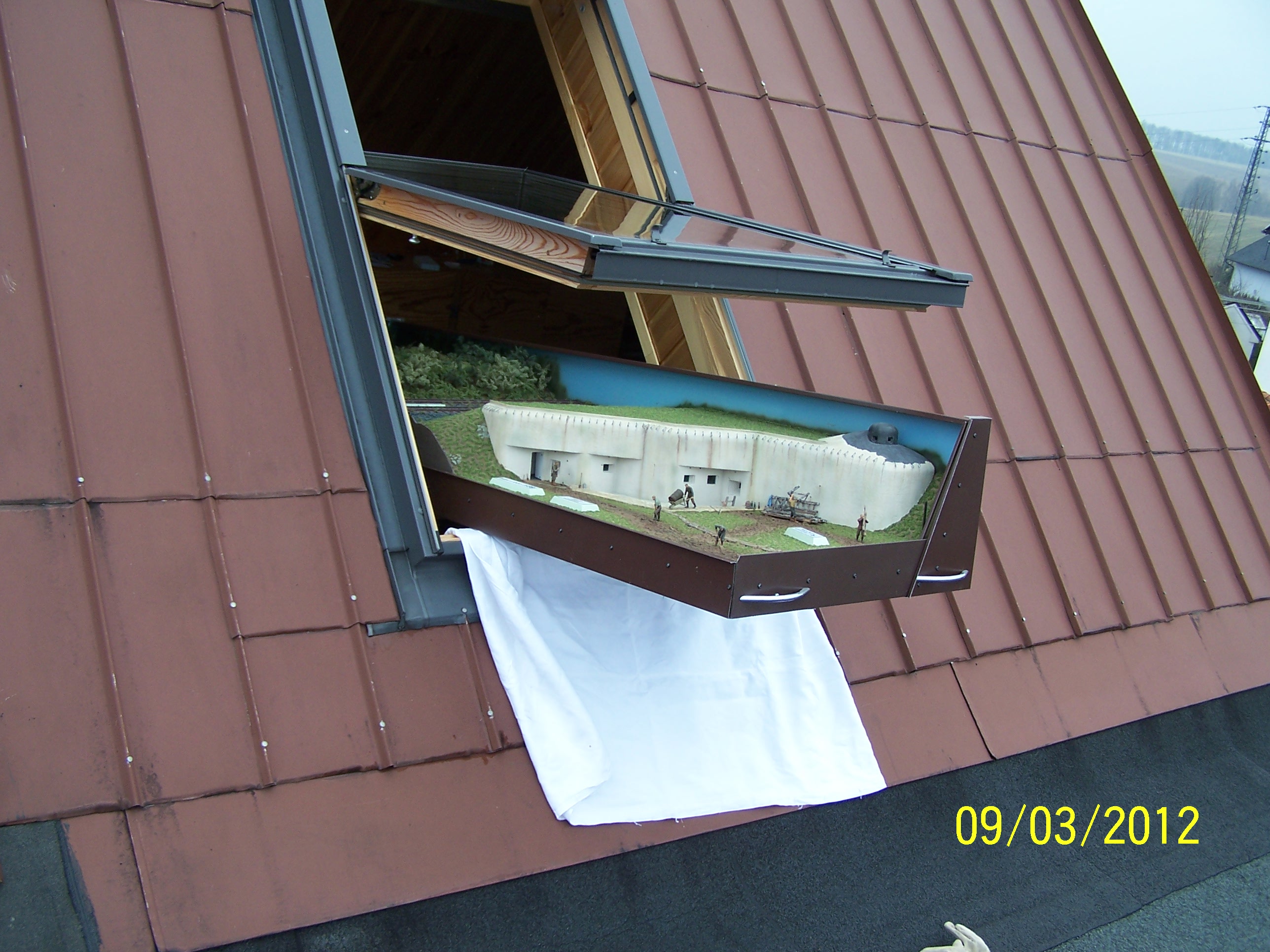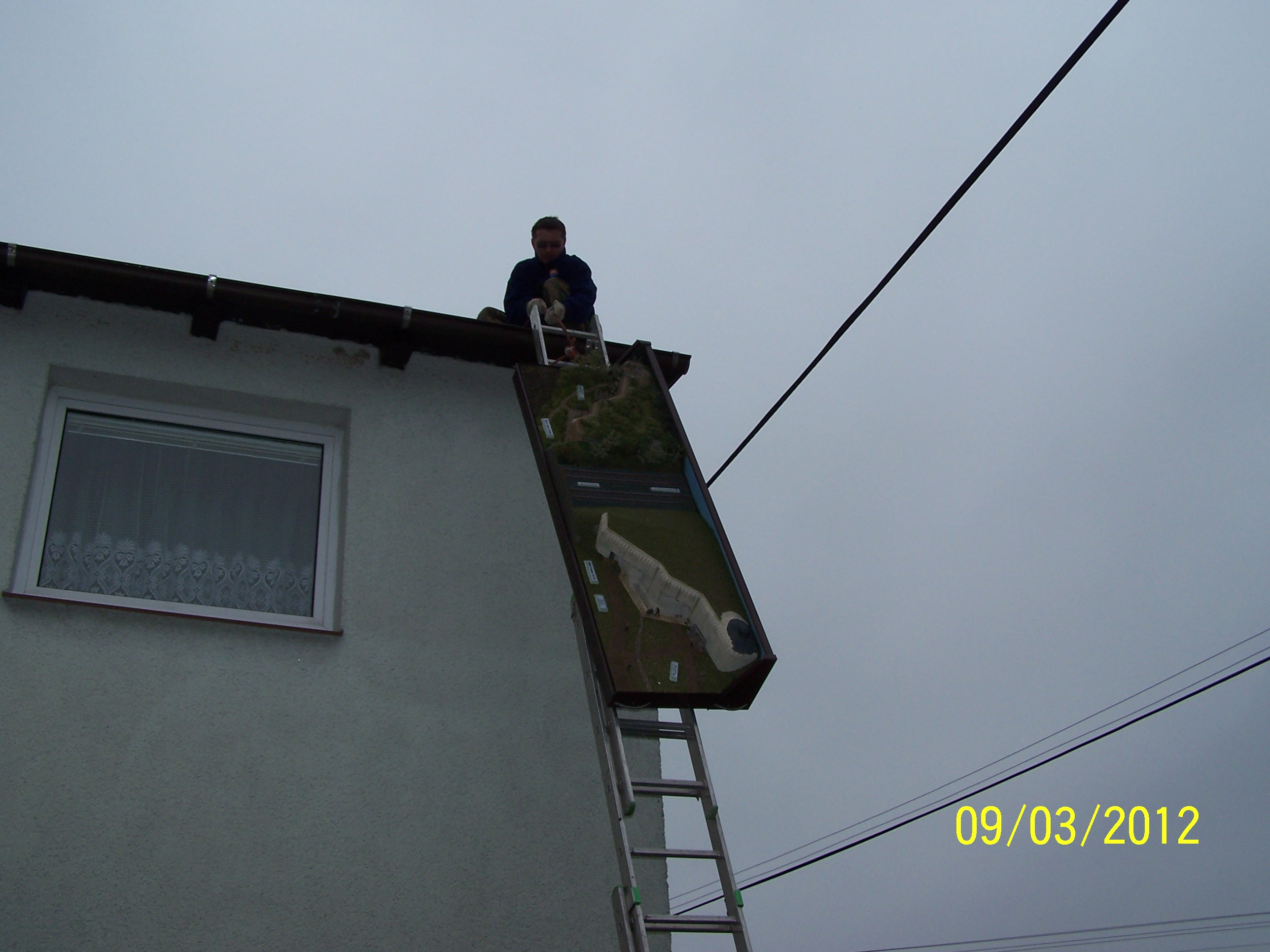 Rozhodl jsem se,že pošlu ještě několik fotek, které sice se samotnou stavbou modelu nesouvisí,ale jsou myslím si, zajímavé tím co musel model absolvovat, aby se dostal na MO-5.Už od počátku stavby jsem věděl,že tak veliký model nepronesu vnitřkem domu,a tak jsem měl vymyšlenou trasu přes střechu.Myslím si,že takový "adrenalin", hned tak nějaký model nezažije.Model jsem stěhoval bez zasklení, aby tak byl co nejlehčí,sklo jsem nalepil až pak.