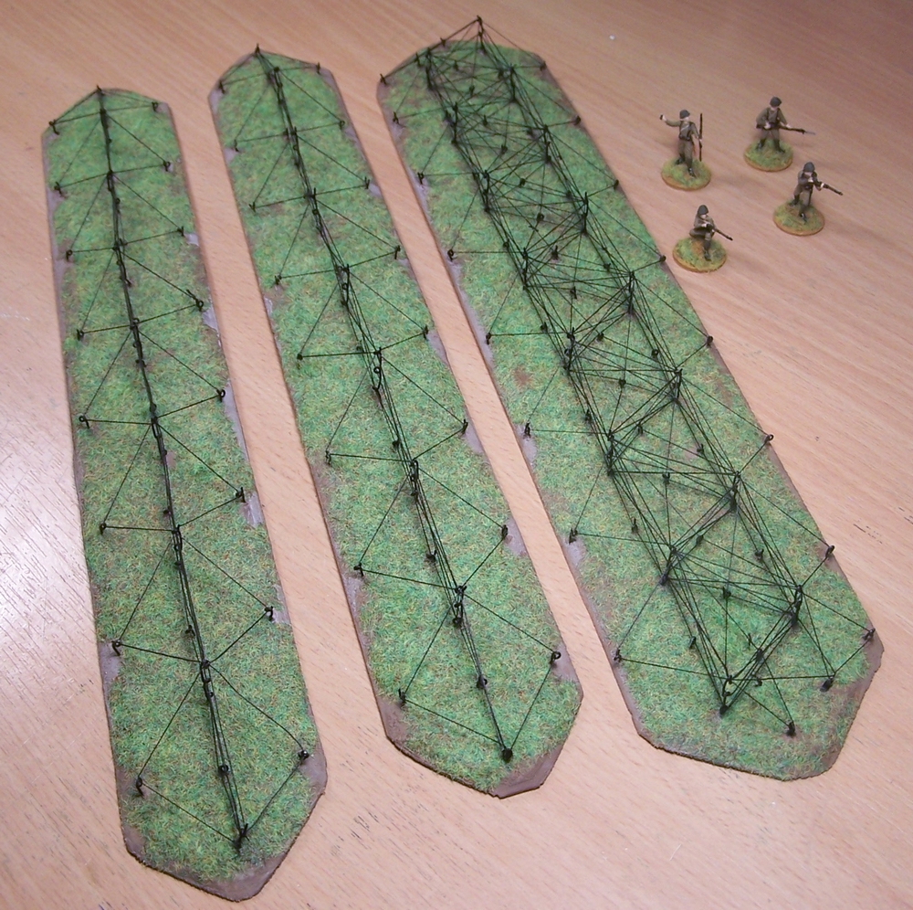 Jednořadá PP s oboustraným kotvením a dvouřadá PP s oboustranným kotvením. Materiál dýha nebo překližka z bedýnky na ovoce, drát, nit, barvy tempera, revell, bezbarvý lak, statická tráva. Měřítko tradičně 1/72. Výplet u dvouřadé nebo víceřadé už asi nikdy opakovat nebudu