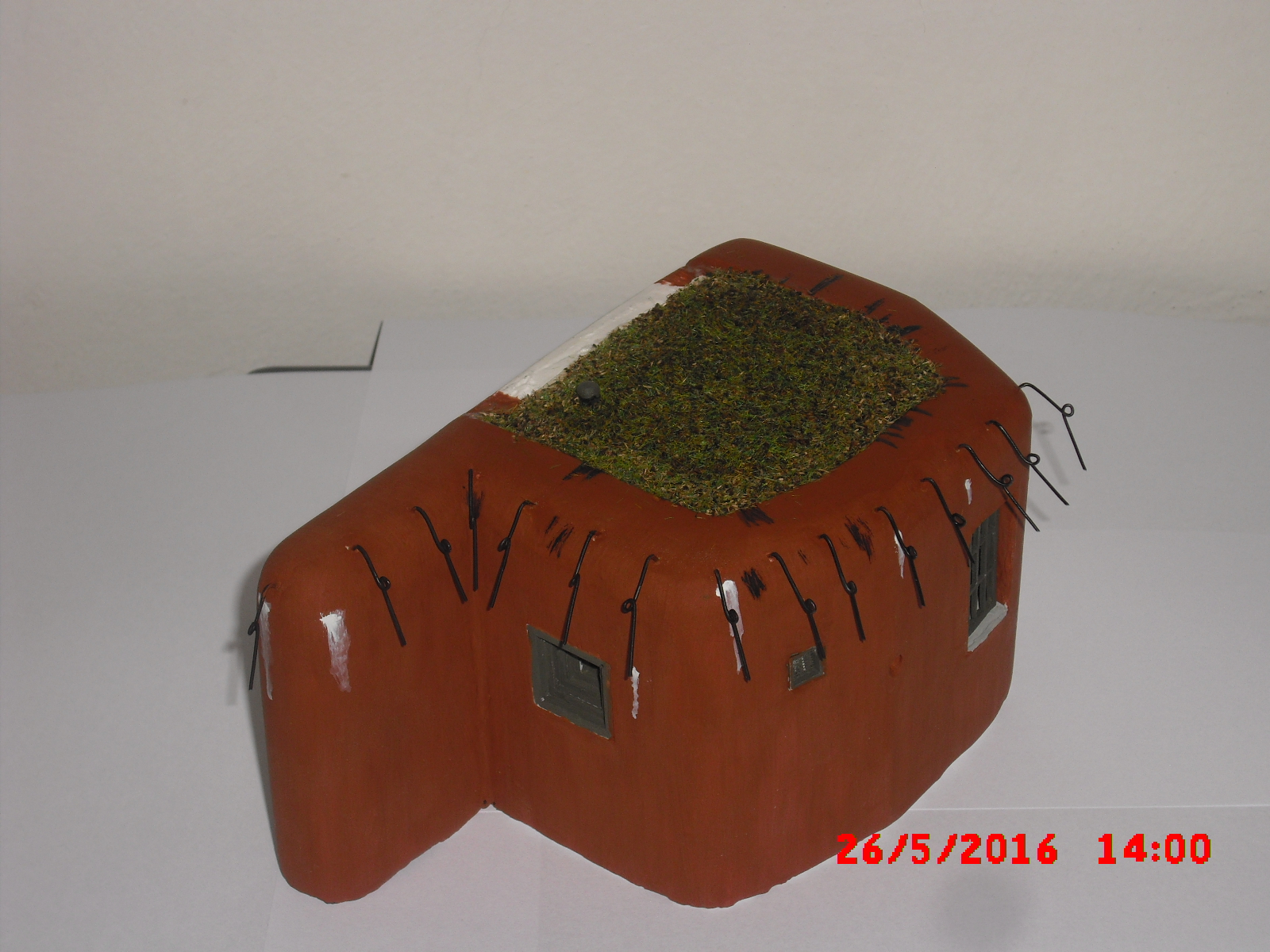 Začal jsem s modelařením čs. opevnění. Hodně zde na fóru čtu vaše příspěvky a kochám se dokonalými modely. Zvláštní obdiv patří těm co tvoří modely z nestavebnic. Uveřejňuji zde fota mého prvního modelu. Je to LO vz.1937, typ A-160 N. Model je kopií objektu č. 16, stavebního úseku C-10, I. sboru. Objekt je situován v Roudnici nad Labem a je zrekonstruován jako muzeum. Model je vyhotoven z polystyrenu. Povrch jsem vytvořil z lepidla na obklady, omítka je z jemného křemičitého písku. Střílny jsou lepeny z polystyrenových L profilů, stejně tak mřížové dveře. Terénní úpravy jsou vyhotoveny z PUR pěny a tmeleno lepidlem na obklady. Povrch zasypán travním posypem pro železniční modeláře. Podotýkám, že je to můj první model, tak buďte při kritice shovívaví. Díky.