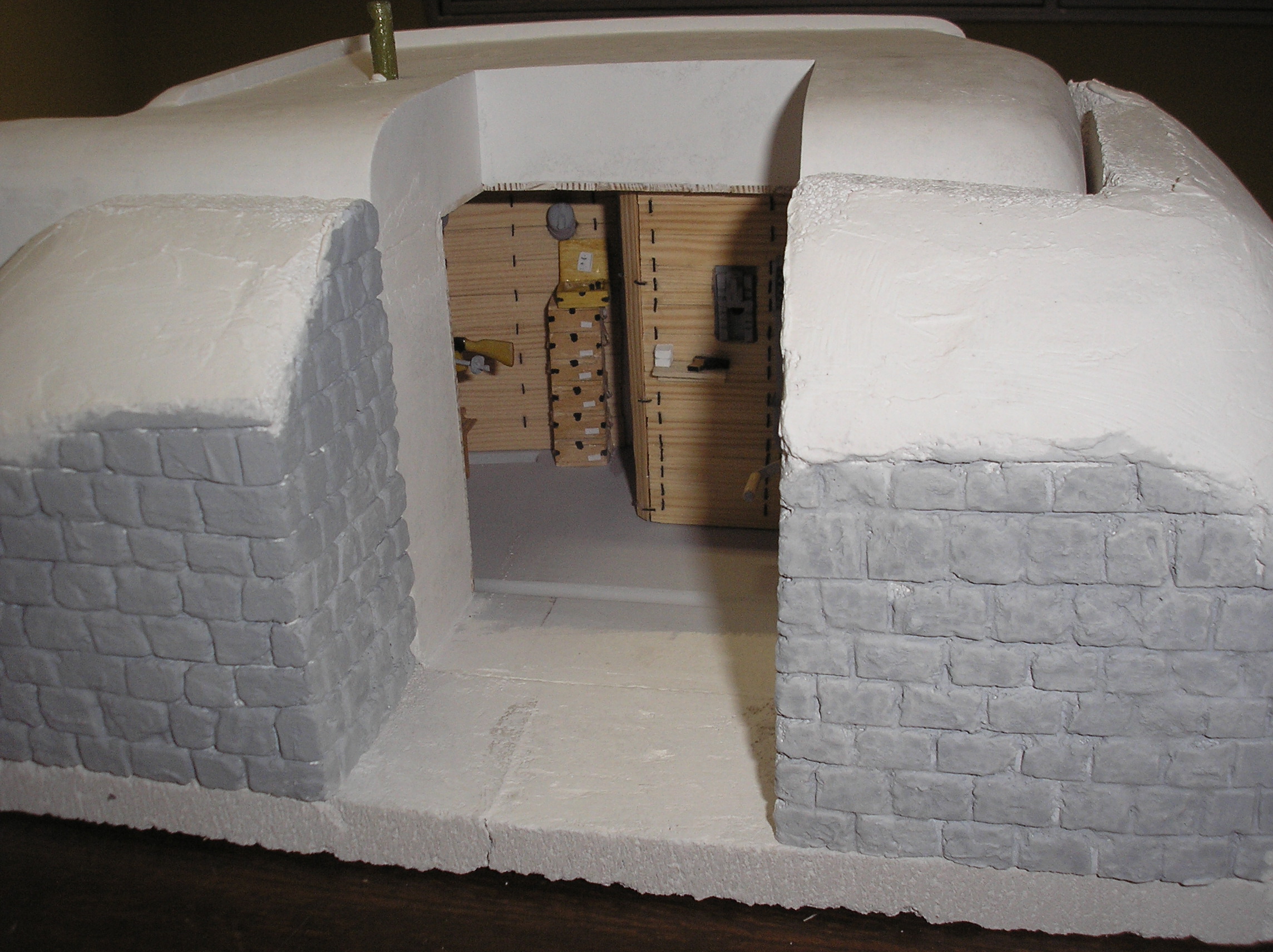 Tak tady je fotečka ještě před instalací lapače splodin. Model je v měřítku 1:20. Velkým pomocníkem byla Velká kniha o malých bunkrech. Počítám ještě alespoň s naznačením záhozu a barevnou fasádou.