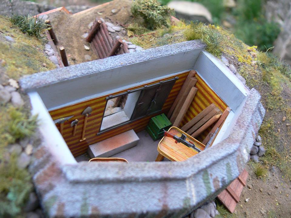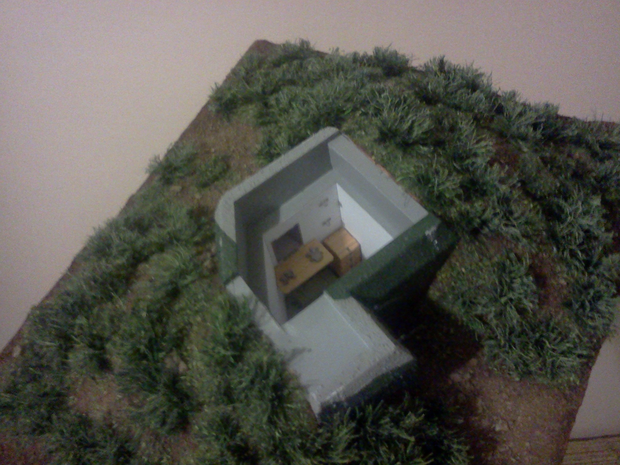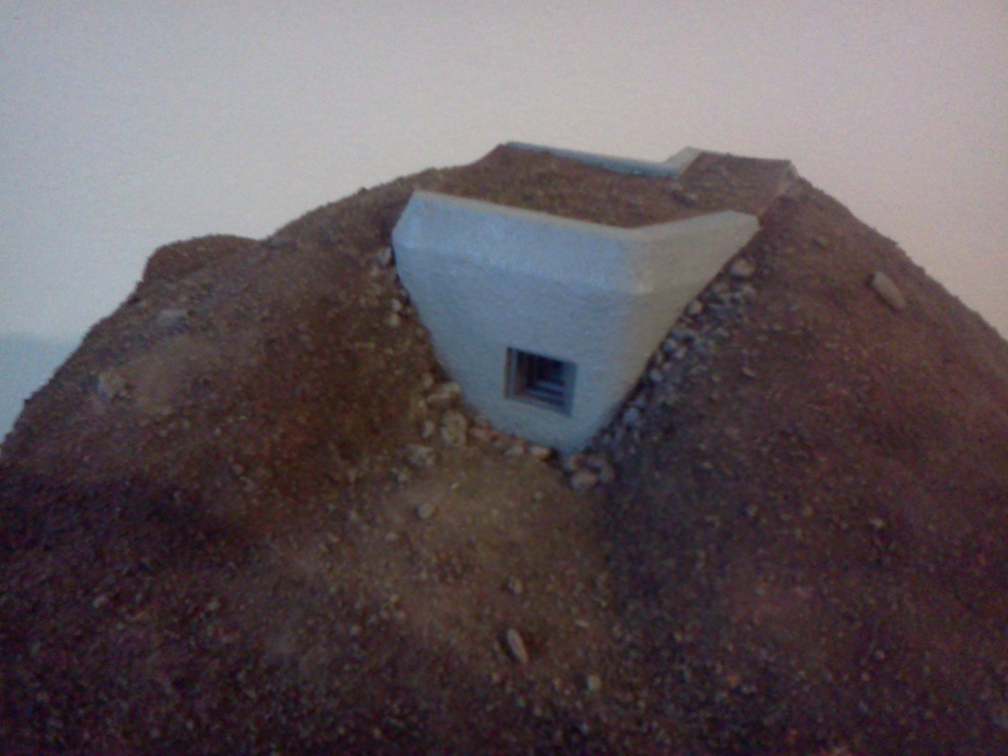 Zkompletovaná pevnůstka s odnímatelným stropem a základ terénu diorámy vyřezaný z extrudovaného polystyrenu. Následovat bude doplnění detailů vystřihovánky v interiéru.
