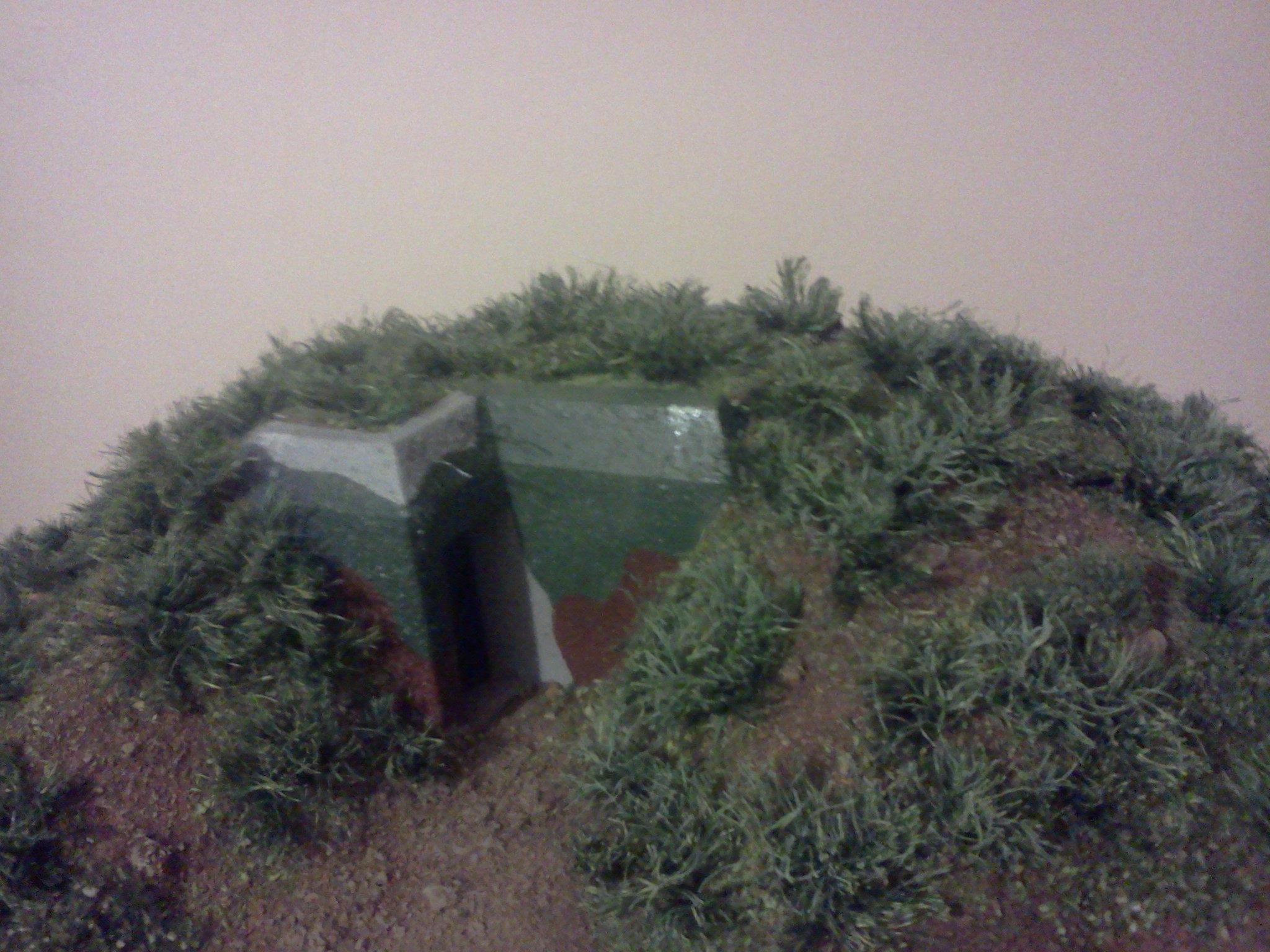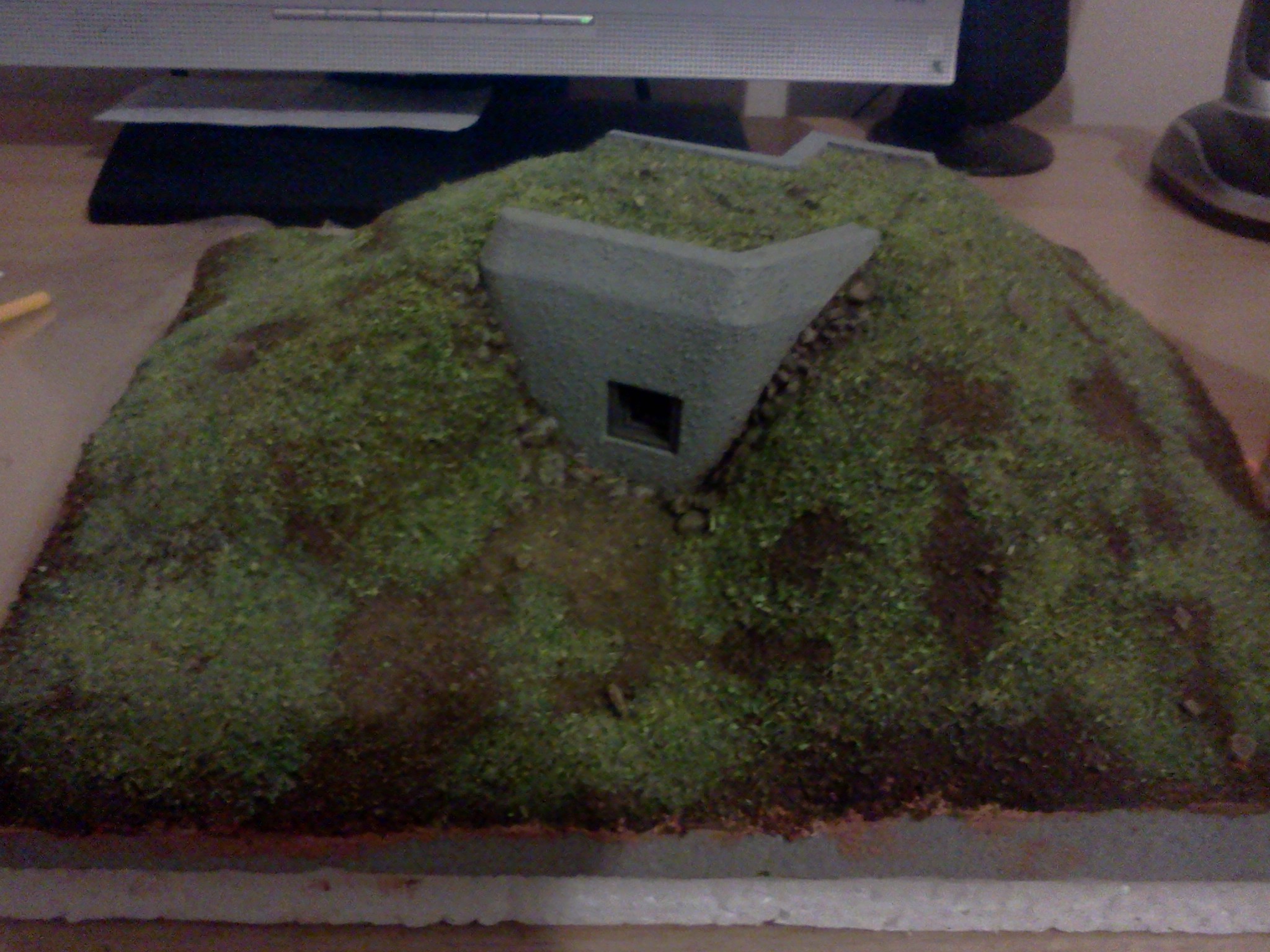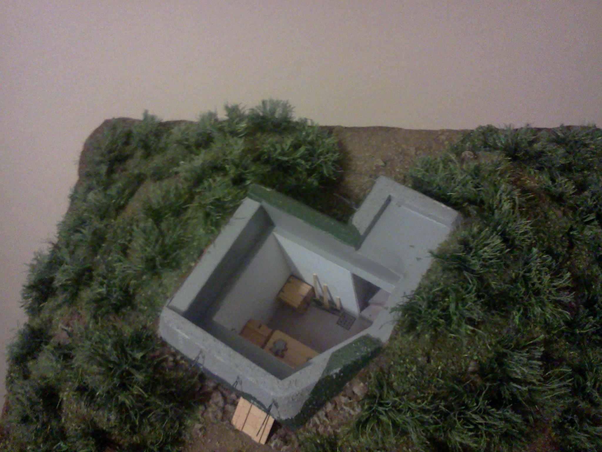 Zkompletovaná pevnůstka s odnímatelným stropem a základ terénu diorámy vyřezaný z extrudovaného polystyrenu. Následovat bude doplnění detailů vystřihovánky v interiéru.