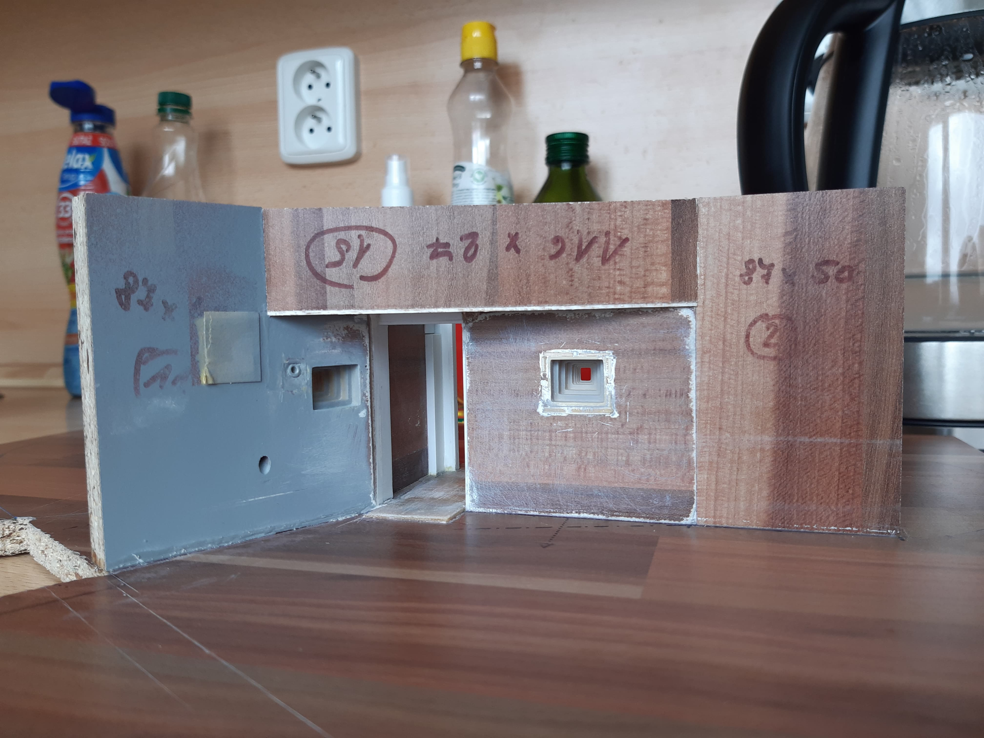 Střílna pro lk vlevo od vchodu s přilehlou částí týlové stěny. Pravá část bude pod krakorcem, na levou vyšší část bude navazovat oblouk střechy. Budu muset vyrobit 4 výdech nebo mřížku. Mřížka by byla jednodušší. Ale správně tam asi má být otevřený výdech, protože srub bude ve stavu po opuštění. Chybí také ústí ústí stěnového periskopu, otvor pro zvonek a ústí granátového skluzu. Ale aspoň jsem začal.