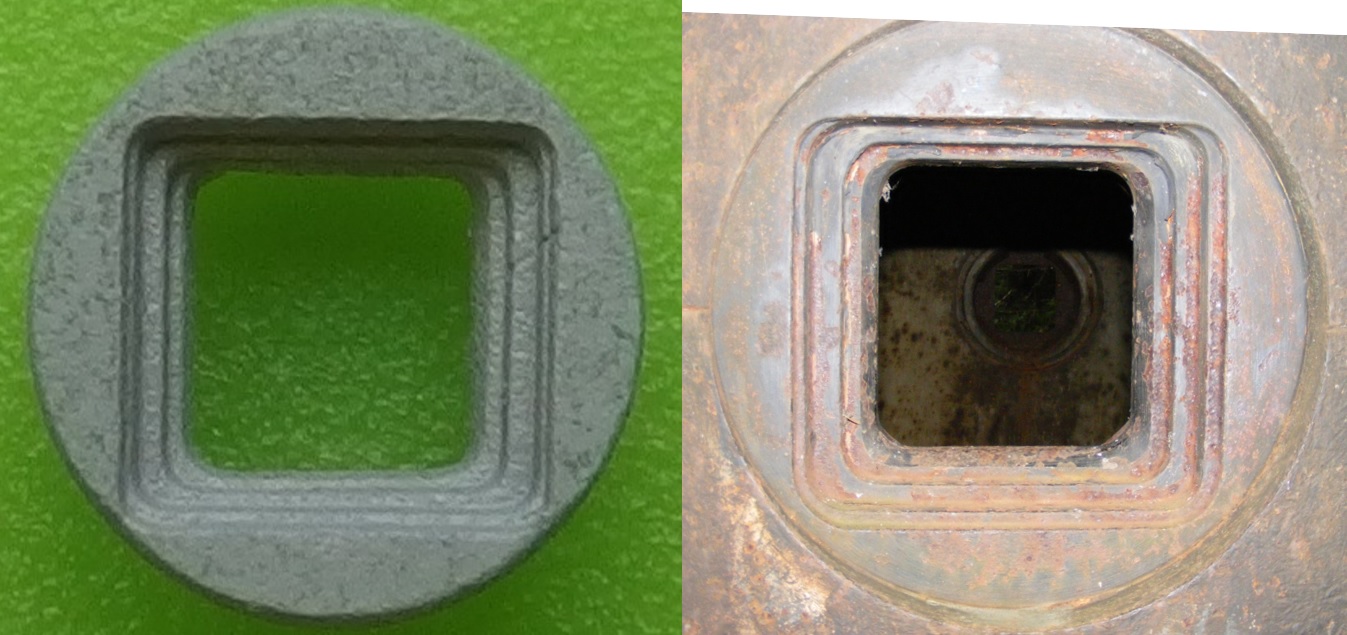 Dalším kouskem je střílnová vložka do zvonu odolnosti 2. Průměr sedí (v měřítku 1:35 je to cca 7,25 mm) a rozložení jednotlivých stupňů je vidět na snímku v porovnání s fotografií originální vložky ze zvonu R-S 90/II.