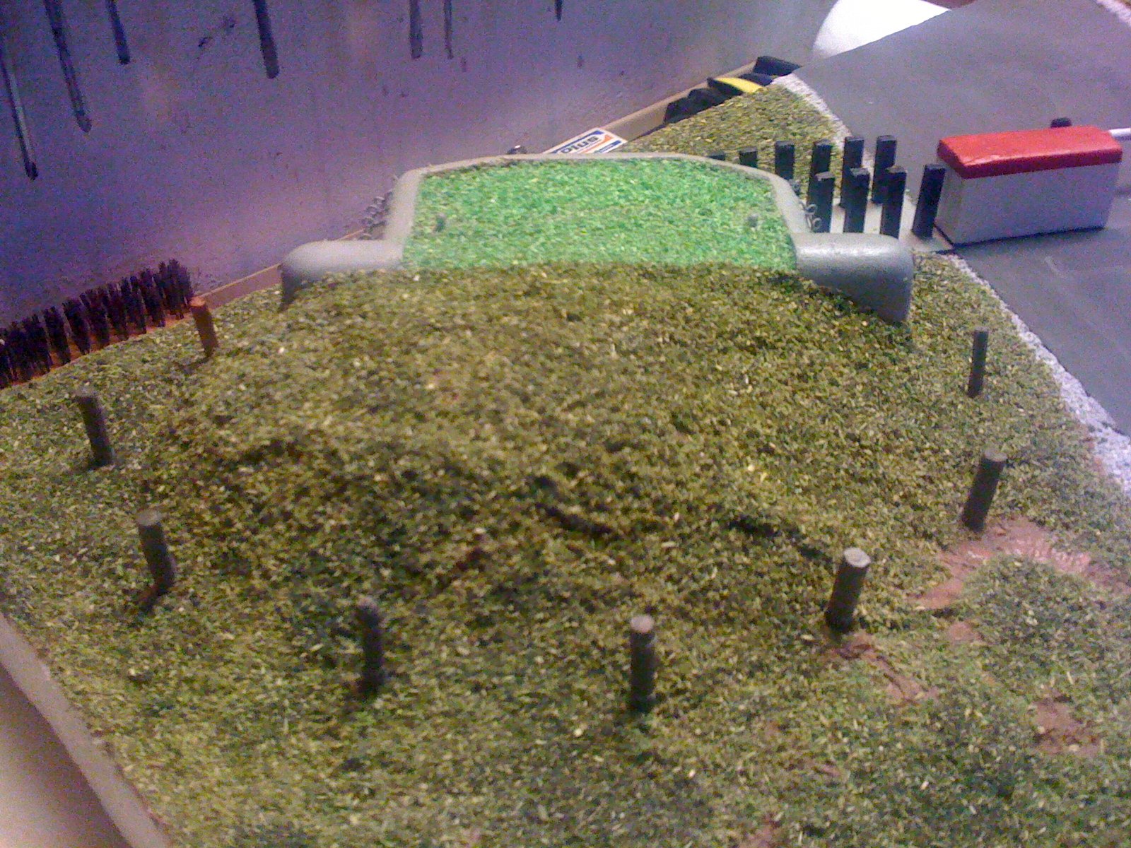 Toho jsme si plně vědom. Původní záměr byl opravdu aby posyp na stropech řopíků byl světlejší. Chtěl jsem to trochu odlišit od okolí a v podstatě to má simulovat čerstvě nasazenou trávu. A pokud jsme neměli na zahradě nějakou opravdu speciální, tak čerstvě nasazená tráva by měla být o něco světlejší. Teď je otázkou, zda to nekazí celkový dojem modelu. Pokud ano, myslím, že nebude problém to přesypat